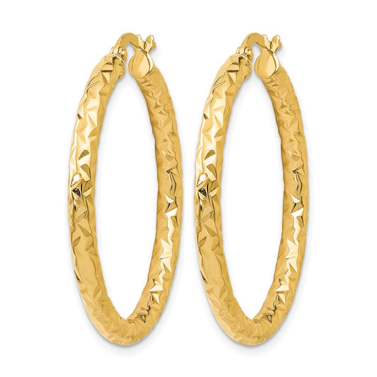 Step into timeless style with our 14K Yellow Gold Foreverlite Hoop Earrings. These elegant earrings boast a polished and textured finish that catches the light beautifully. Crafted from genuine 14K gold, they promise lasting quality. The hoops measure 34 mm in length and 3 mm in thickness, offering a bold...