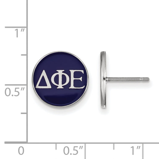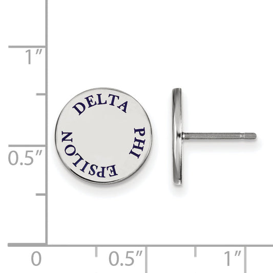 The Sterling Silver Rhodium-Plated Logoart Delta Phi Epsilon Sorority Text Color Enamel Post Earrings are a stylish way to show sorority pride. These earrings are made from high-quality sterling silver with a shiny rhodium finish, ensuring durability and a sleek look. Each pair features a small 12 mm button design...