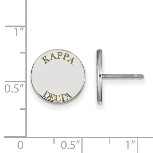 Show off your Kappa Delta pride with the LogoArt Sterling Silver Rhodium-Plated Kappa Delta Sorority Text Enamel Post Earrings. Crafted from high-quality 925 sterling silver, these 12mm button earrings feature a sleek polished finish. The olive green enamel detail adds a pop of color, making them stand out. Designed with...