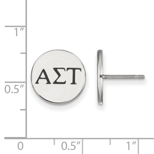 Show your pride with the Sterling Silver Rhodium-Plated Logoart Alpha Sigma Tau Sorority Greek Letters Black Enamel Post Earrings. These small, stylish earrings are made from pure sterling silver with a polished finish, measuring 12 mm in length. They feature sleek black enamel accents that add a bold touch. The...