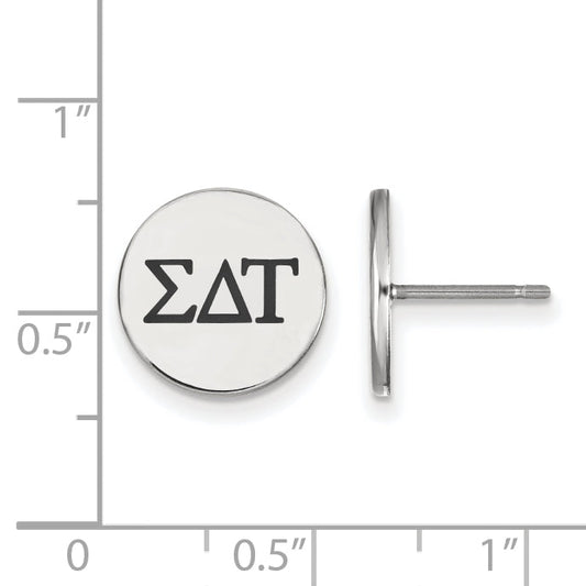 The Sterling Silver Rhodium-Plated Logoart Sigma Delta Tau Sorority Greek Letters Black Enamel Post Earrings are a sleek way to show sorority pride. Crafted from high-quality sterling silver, these earrings shine with a polished finish. The compact 12 mm size makes them perfect for daily wear. They feature bold black...