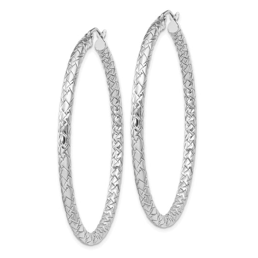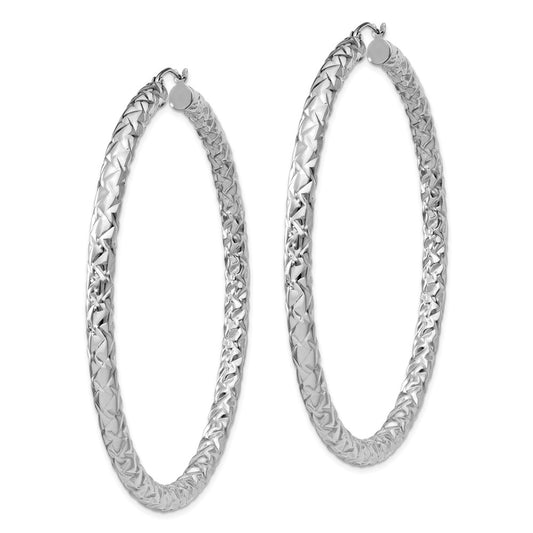 Introducing the Sterling Silver Rhodium-Plated Textured 4X60mm Hoop Earrings. These hoops exude elegance with their polished finish and bold 64mm length. Crafted from 925 sterling silver, these earrings boast a sleek rhodium plating, offering a timeless white hue. Their textured surface enhances its gleam, making them a standout piece. Lightweight...