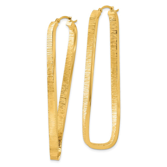 Embrace elegance with these 14K Yellow Gold 4mm Textured Twisted Oval Hoop Earrings. Crafted from high-quality 14-karat gold, these hoops boast a polished finish that radiates a warm glow. The unique twisted oval design adds a contemporary twist to a timeless classic. Measuring 54mm in length, these earrings are perfect...