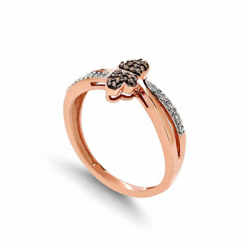 Express your love with a glimmering diamond ring that embodies your romance. Our 10K rose gold fashion ring boasts two heart-shaped frames adorned with exquisite champagne diamonds, resting next to one another. The double shank of the ring is lined with both sparkling diamonds and a warm, inviting color contrast. With a total weight of 1/10 ct. t.w., this delicate ring is polished to a brilliant shine that will leave a lasting impression.