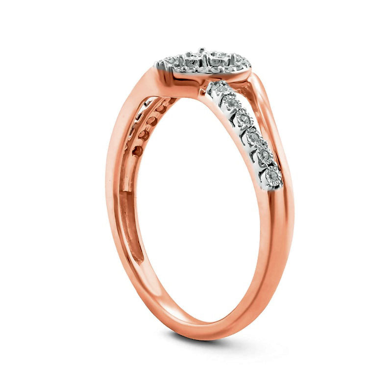 This is a lovely diamond promise ring made of 10K rose gold. It has a heart-shaped frame that's lined with diamonds and a composite of diamonds in the center. The diamonds are placed to make them look bigger and more sparkly. The ring also has more diamonds along a curved design and two polished ribbons that split the band. It has 1/10 ct. t.w. of diamonds and looks very pretty.