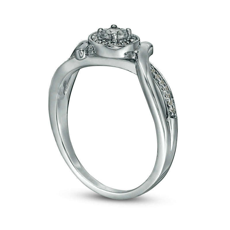 Express your emotions with this stunning 1/10 CT. T.W. Composite Diamond Ribbon Split Shank Promise Ring in Sterling Silver. Fashioned with exquisite attention to detail, this piece exudes elegance and refinement. The sterling silver band perfectly complements the round diamond centerpiece, which is adorned with diamond embellishments around it. The bypass shank with diamonds adds a touch of sophistication to the design. With a total weight of 1/10 ct. t.w., this promise ring sparkles brilliantly and is sure to make a statement. This ring is custom-made to ensure a perfect fit and cannot be resized after purchase. Get ready to impress with this remarkable promise ring that symbolizes your bright future together.