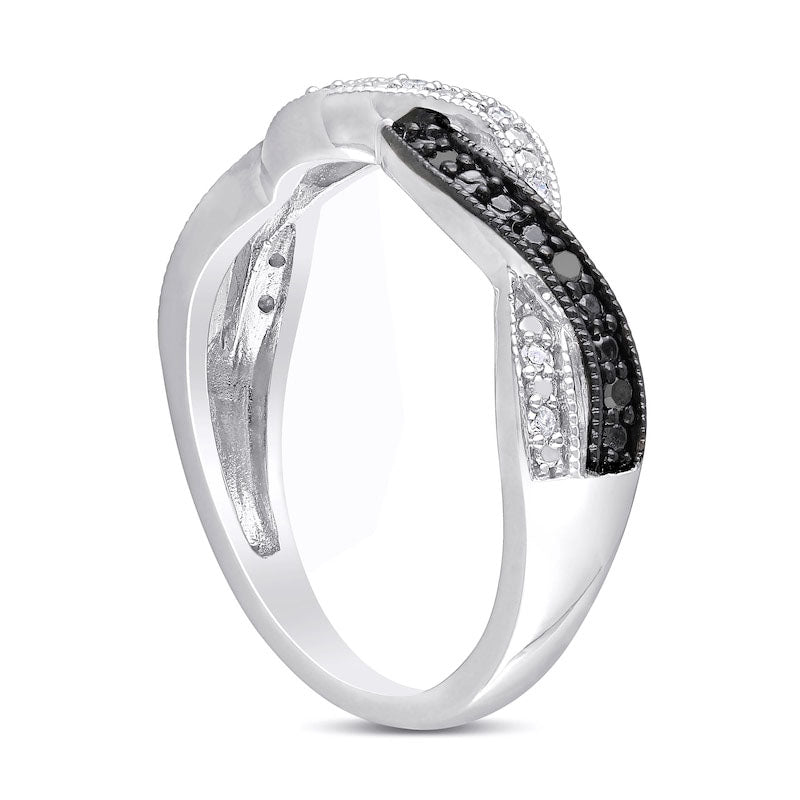 Experience a blend of contemporary hues and classic motifs with this stunning diamond ring. Meticulously fashioned in lustrous sterling silver, this exquisite piece showcases a graceful twist design featuring two interlaced beaded ribbons. One of these ribbons is adorned with sparkling white diamonds, while the other boasts of glistening black diamonds encased in black rhodium plating. With a remarkable 1/10 ct. t.w. of diamonds and a radiant polished finish, this ring resonates with your unique style. Please note that this ring is available in limited sizes and cannot be resized after purchase.