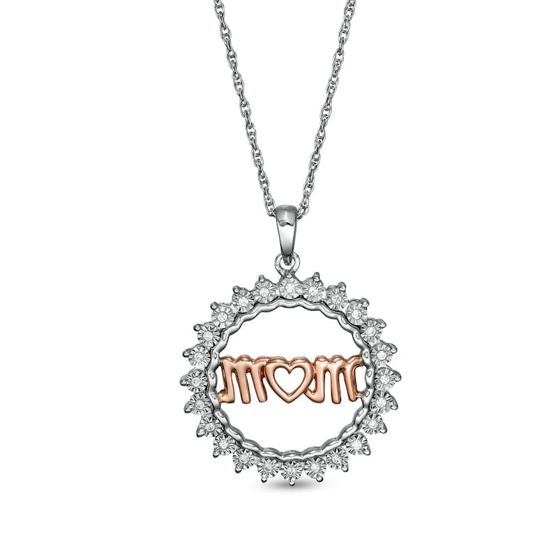 0.1 CT. T.W. Natural Diamond mom" Heart Sunburst Frame Pendant in Sterling Silver and 10K Rose Gold"