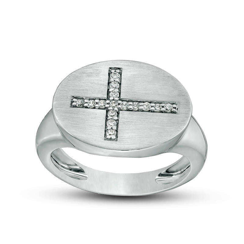 Experience the perfect balance of faith and fashion with this magnificent diamond cross signet ring. Meticulously crafted in lustrous 10K white gold, the traditional design is given a modern twist with a dazzling diamond cross that is stylishly placed on one side of the flat-top surface. With an impressive 1/10 ct. t.w. of sparkling diamonds that radiate a brilliant shine, this signet ring is the perfect addition to any jewelry collection. The ring is polished to perfection, ensuring that it sets an elegant tone for any occasion.