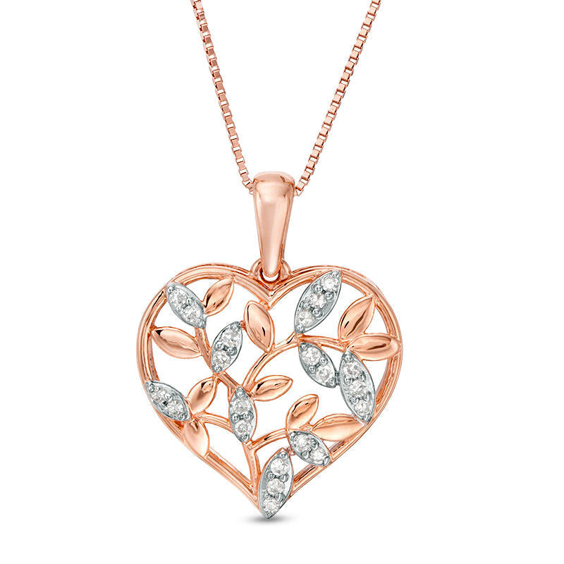 0.1 CT. T.W. Natural Diamond Vine-Patterned Heart Pendant in 10K Rose Gold