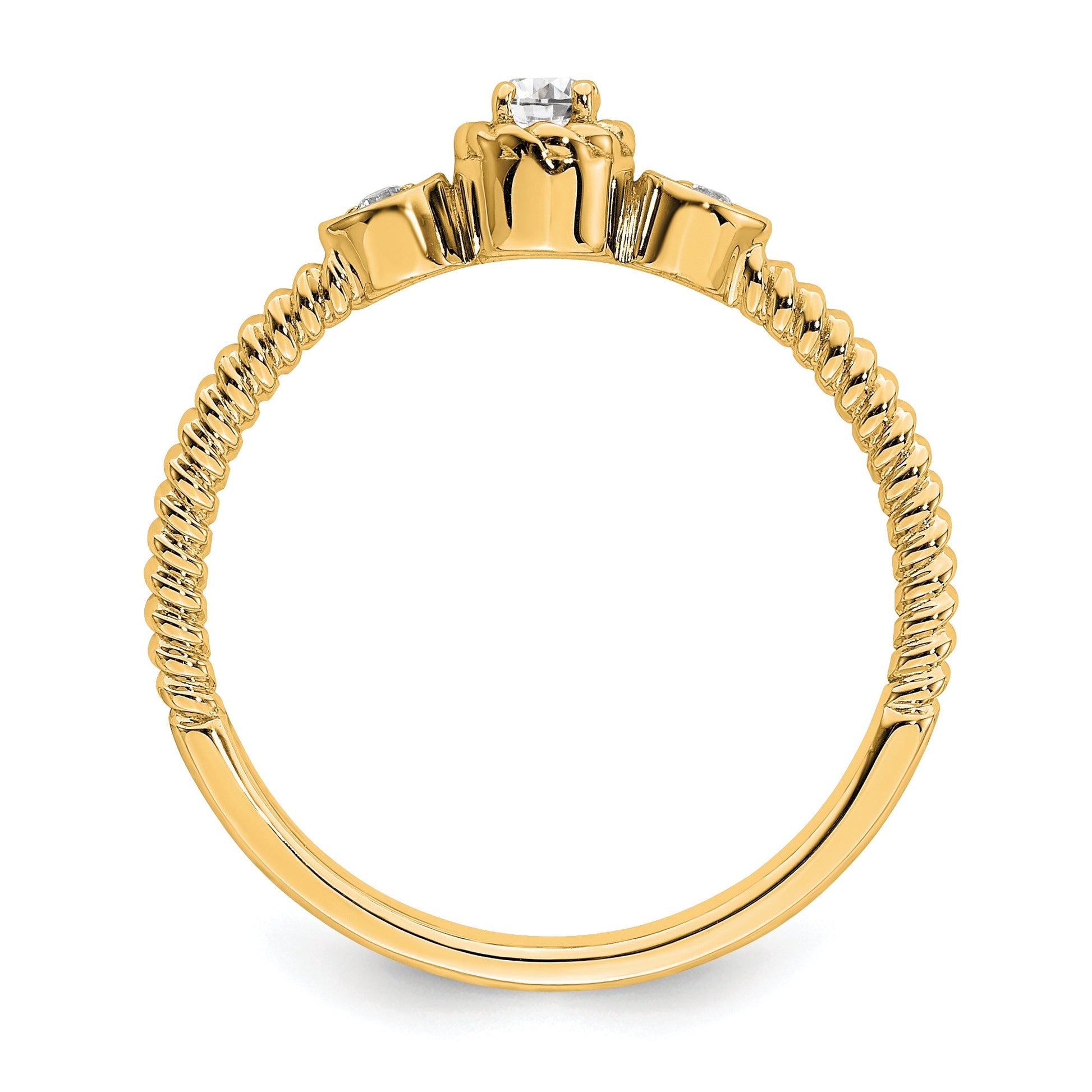 This ring boasts a tapered band width of 1.4 to 1.7mm and features one round 4mm stone and two round 1.4mm stones, all prong set. The head height is 4.2mm, and the ring top measures 11.4mm in length by 4.4mm in width. The profile is open back and the head type is round with a 4-prong setting. The stone clarity is I1 (AA) and the completeness is confirmed with the inclusion of all stones. This delightful piece of jewelry is sold by unit and is an ideal choice for any discerning woman seeking a quality engagement ring.