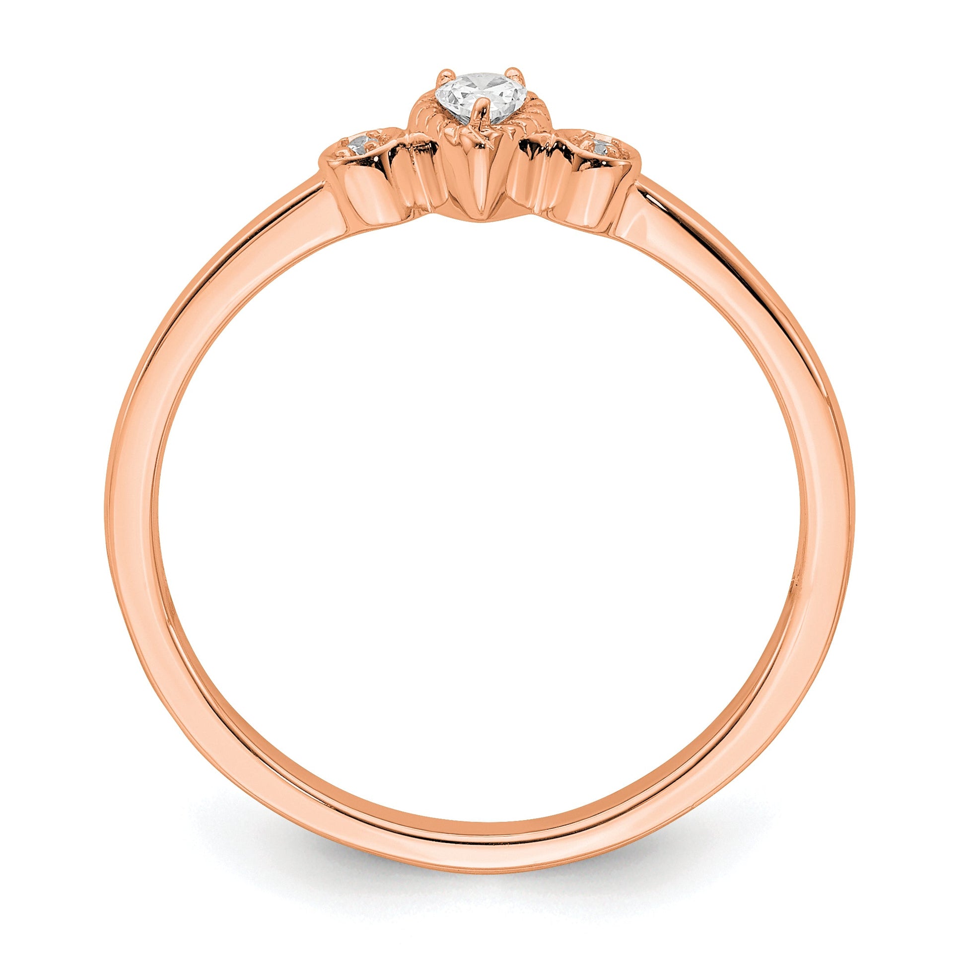 This is a real 14k rose gold ring with a pear-shaped cubic zirconia stone and two small round stones on the sides. The ring is polished and has a rope edge design. It's available in other colors of gold as well. The stones are high quality and set by experienced jewelers. You can also choose to upgrade to natural diamonds for an extra cost. This is a great gift for special occasions or just to show someone you love them. We offer a 30-day money-back guarantee and the ring comes with a gift box.