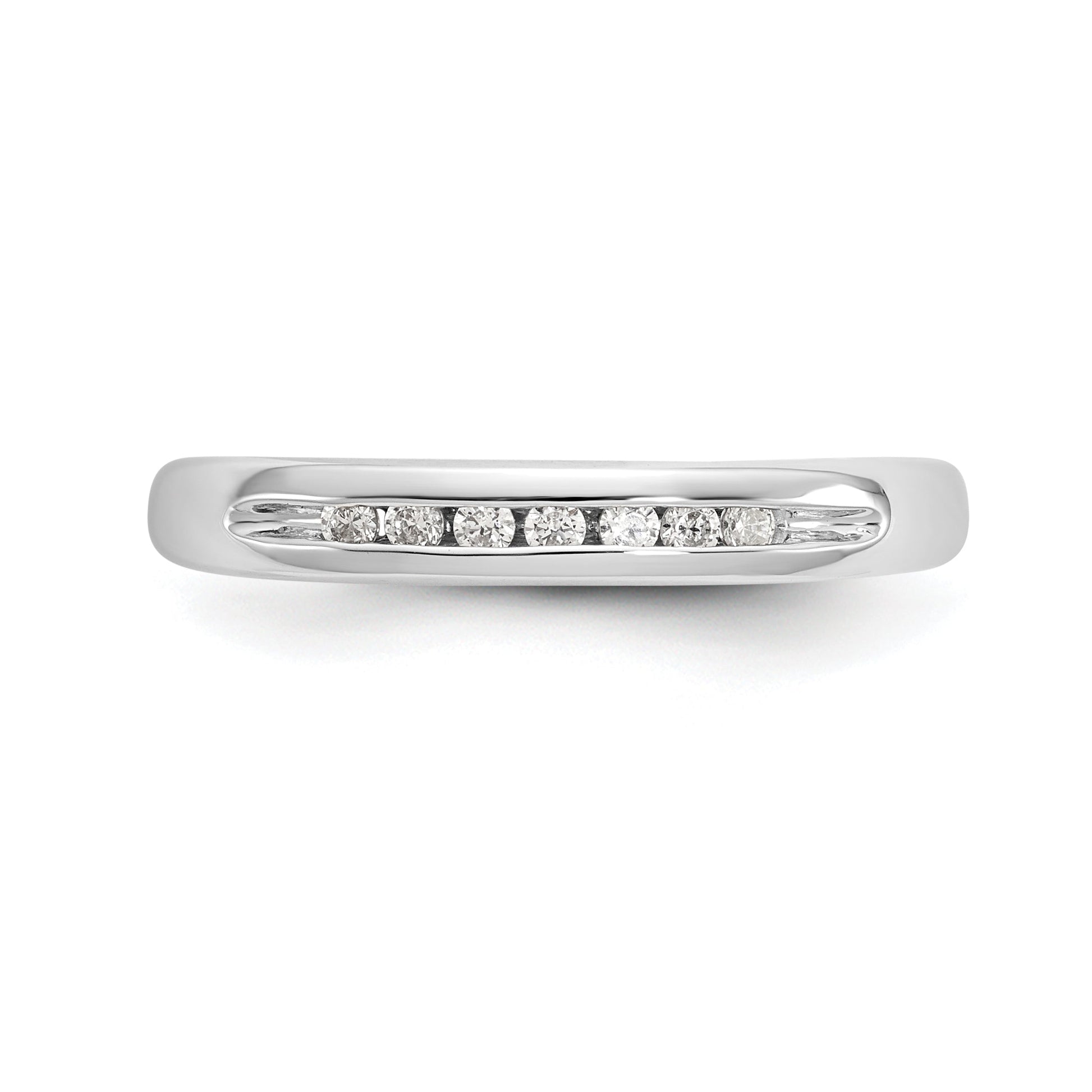 This is a wedding band ring made of real 14K white gold, with seven cubic zirconia stones that sparkle like diamonds. You can also choose to have it made with natural diamonds instead. It comes in a gift box and has a 30-day money-back guarantee. The band is 4.3 to 3.4mm wide and can be resized. It's a beautiful and affordable alternative to expensive diamond rings that's perfect for special occasions or everyday wear.