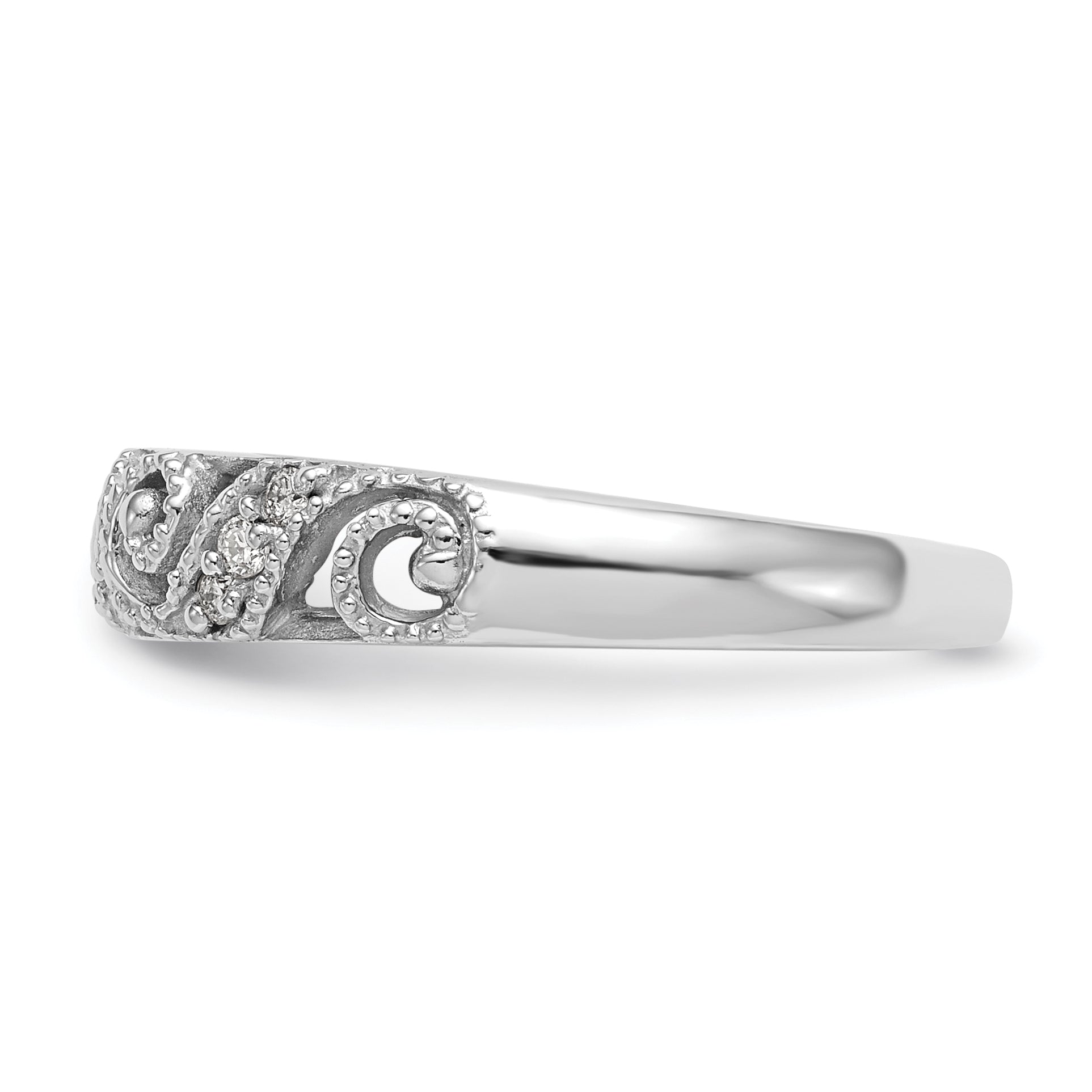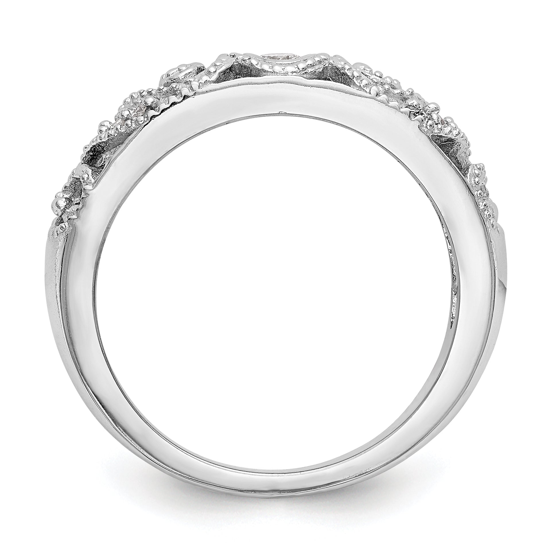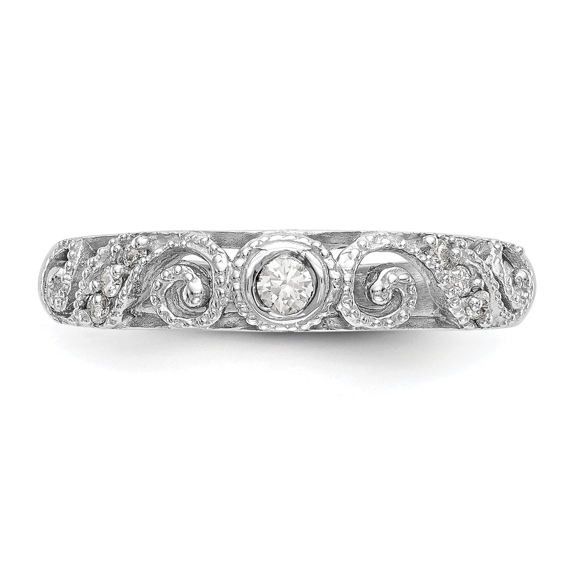 This ring is crafted with a polished finish, tapered band with a thickness of under 1.5mm, and features one 2.5mm round cubic zirconia and six 1.3mm round cubic zirconia stones. It is sizeable for a perfect fit and is not recommended for engraving. This wedding band is sold individually and is a true symbol of love that will last a lifetime.