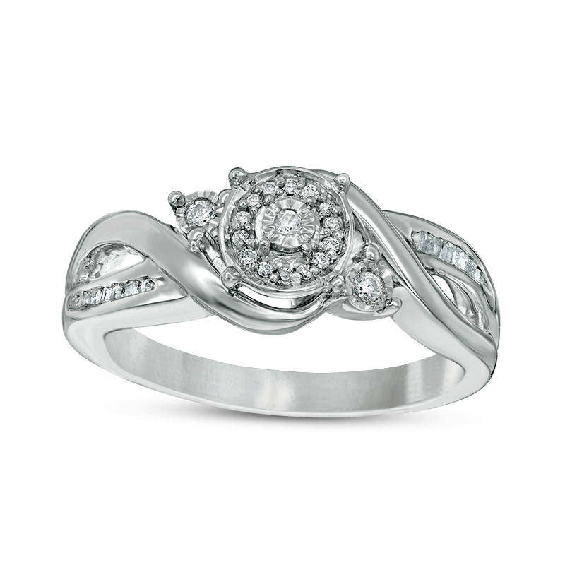 Make a heartfelt promise with this exquisite diamond ring. Carefully crafted in stunning sterling silver, the ring boasts a striking center diamond, strategically placed to magnify its brilliance and size. Adorned with a captivating diamond frame, this beauty also features two diamonds on either side of the center stone, making it even more alluring. An elegantly designed ribbon bypass gracefully intertwines over a combination of round- and baguette-cut diamonds, creating an intricate split shank. With a brilliant luster and a total weight of 1/8 ct. t.w., this promise ring symbolizes your bright and beautiful future together. This ring can be custom-made to fit her finger size, but please note that sterling silver rings cannot be resized after purchase. Make this ring the symbol of your everlasting commitment.
