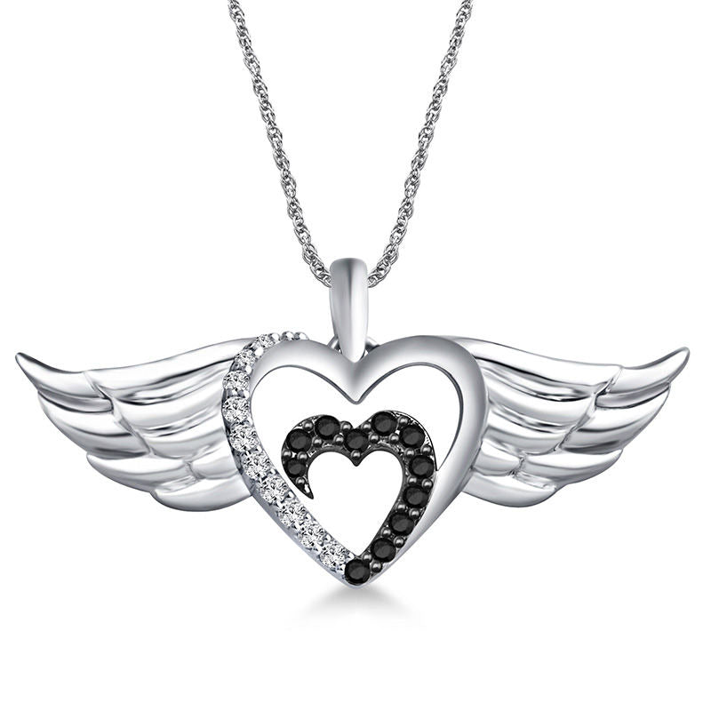 0.13 CT. T.W. Enhanced Black and White Natural Diamond Double Winged Hearts Pendant in Sterling Silver