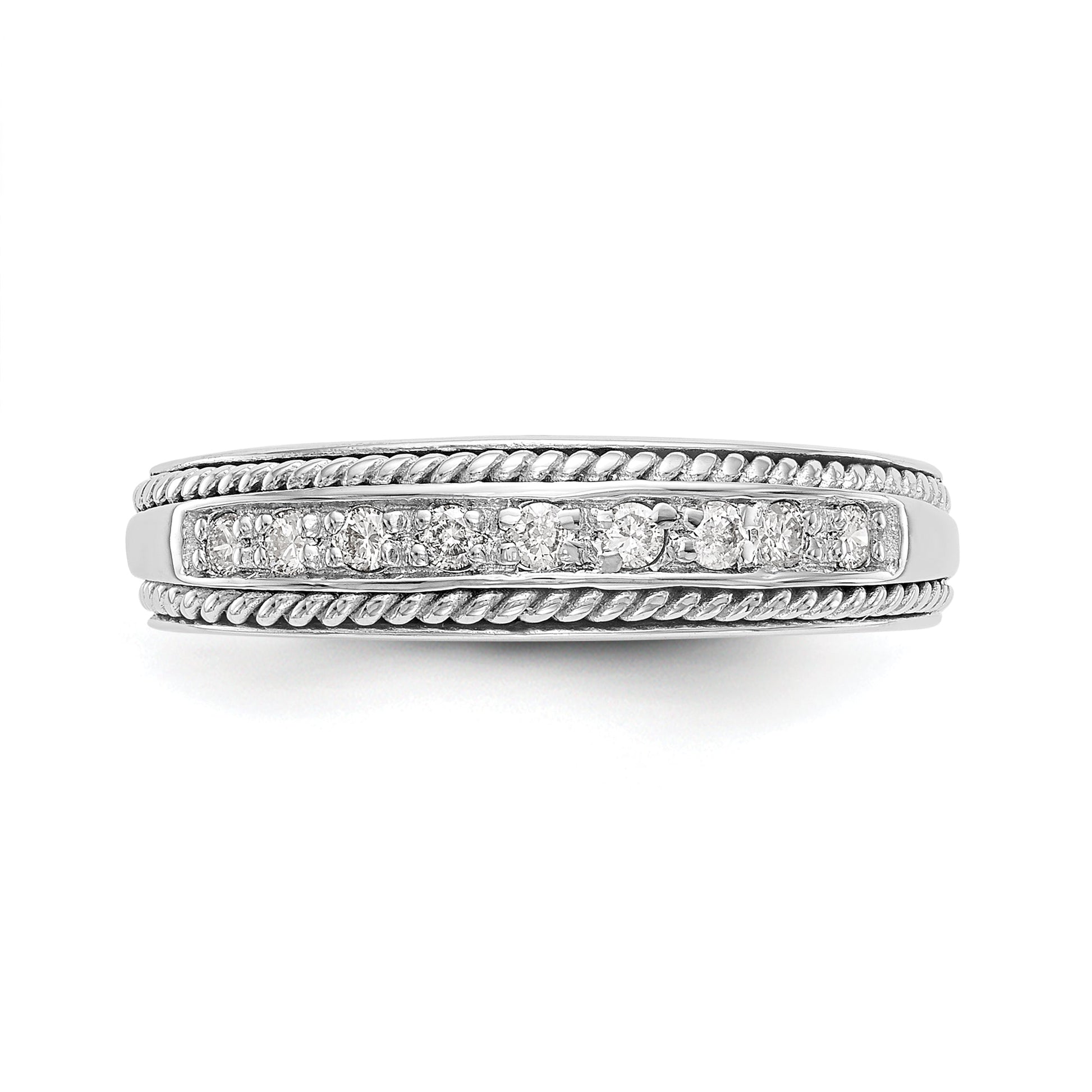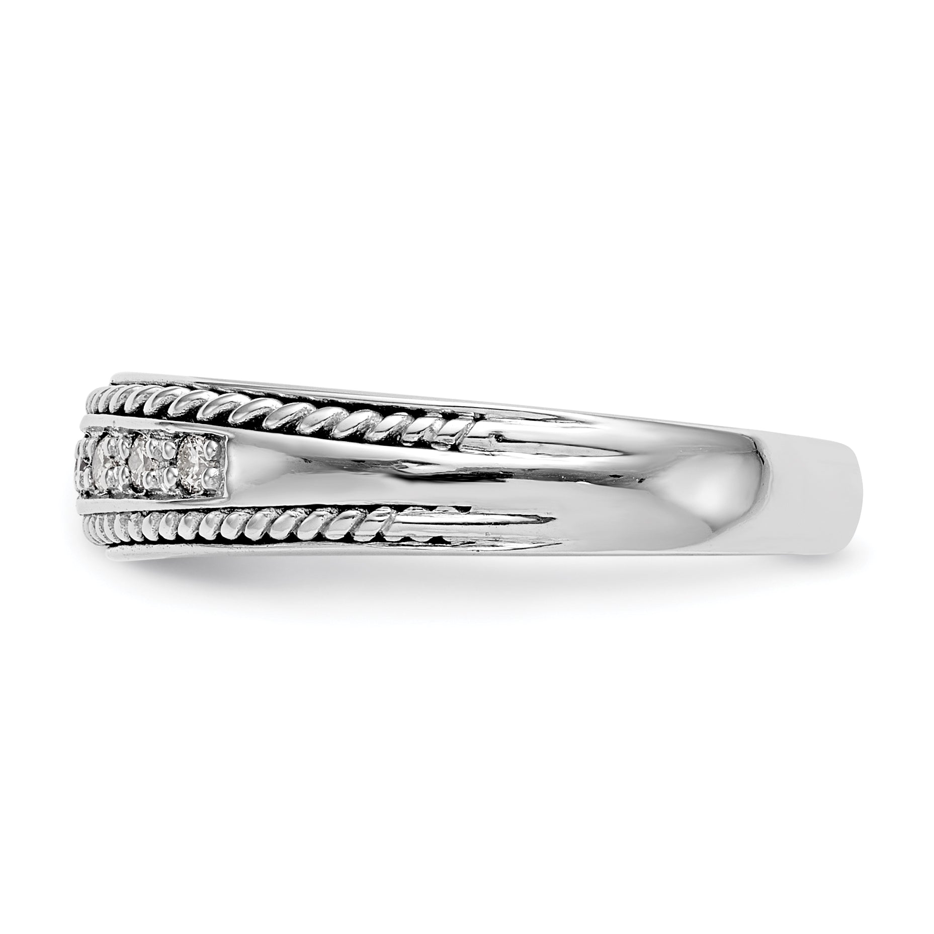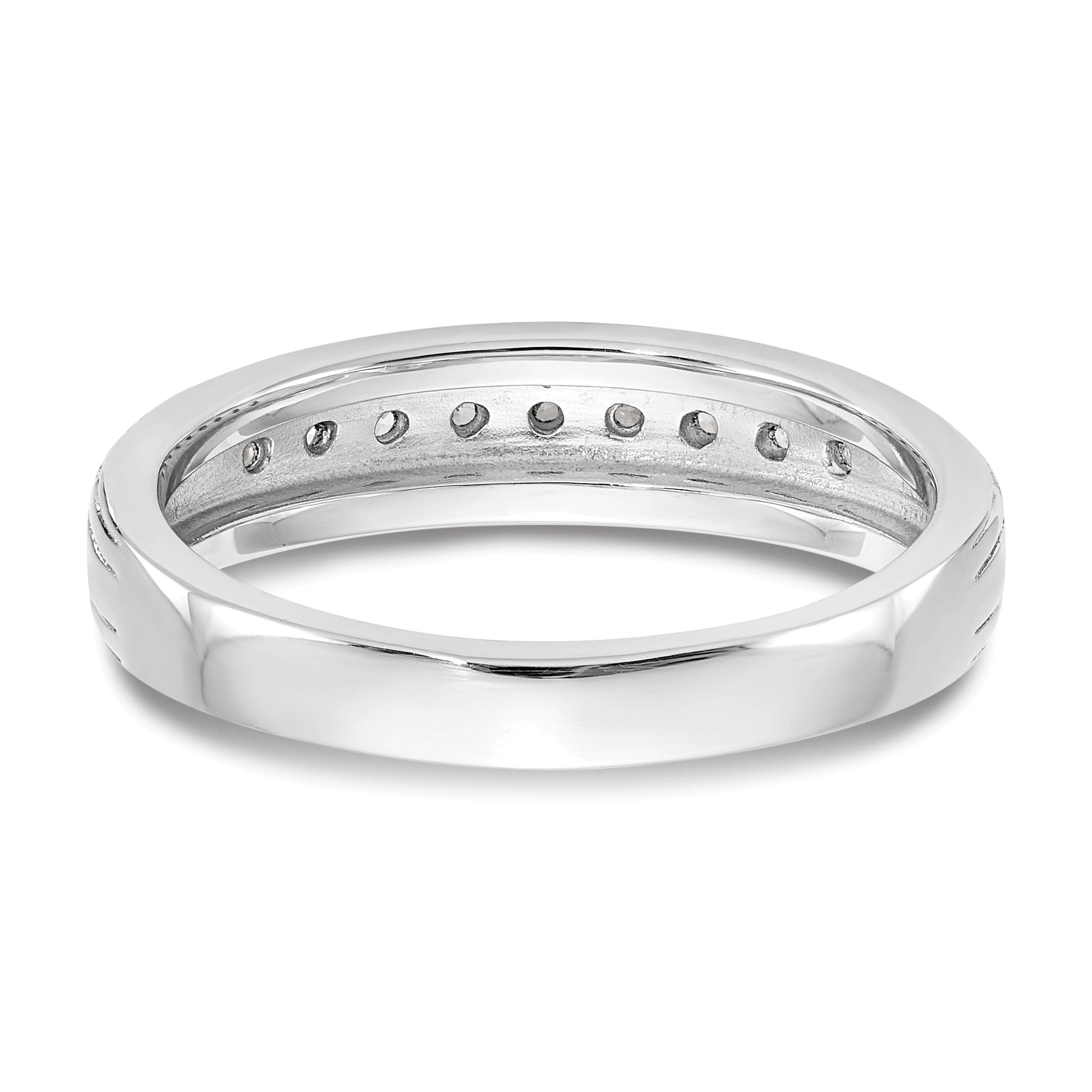 If desired, the ring can be upgraded to real diamonds upon request. It makes a wonderful gift for birthdays, anniversaries, Valentine's Day, Mother's Day, engagements, weddings or any special occasion. You can be confident in your purchase with our 30 day, hassle-free, money-back guarantee and complimentary gift box. Plus, we offer superior customer service as a USA based company. The ring is tapering in width, from 4.6 to 2.8 mm, and has a polished finish. The 9 round-cut cubic zirconia stones have a total weight of 0.14 ct, with a size of 1.5 mm each. The ring is complete and all stones are included, suitable for resizing. The band is designed with a closed back and crafted through a casting process.