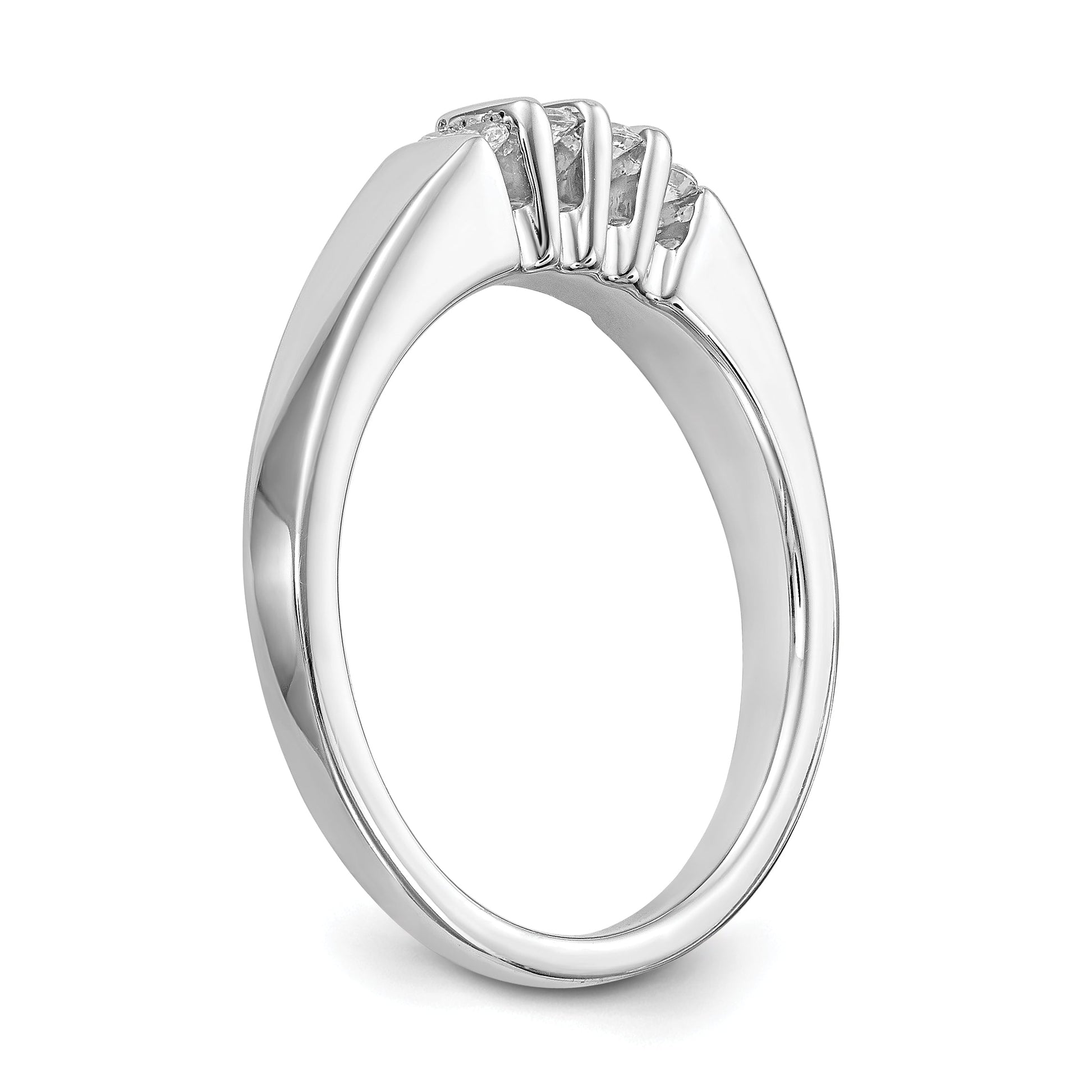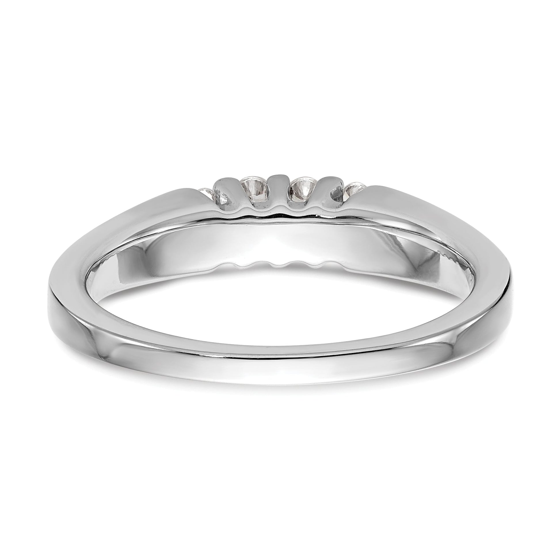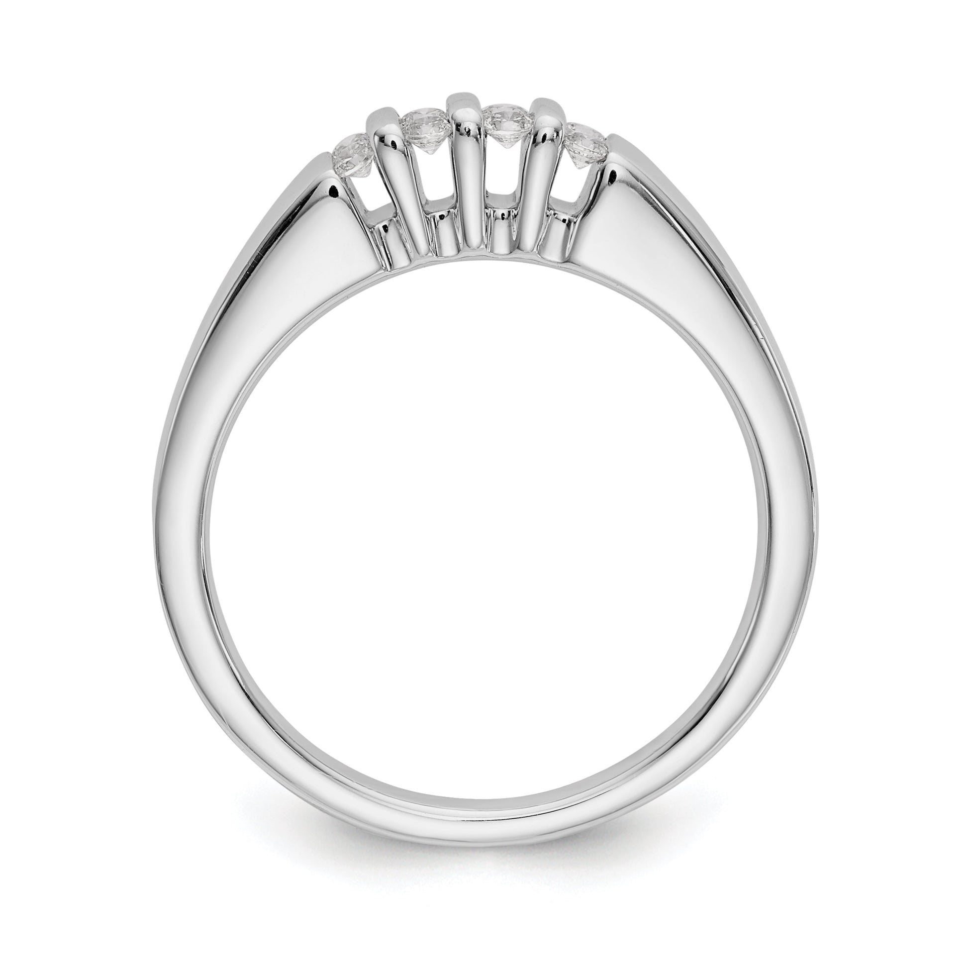 With a polished finish and rhodium plating, this ring has a tapered width of 3.4 to 2.4 mm and features 4 round-cut cubic zirconias on each side. The head height measures 8.4mm and the band is sizeable up to Size 8.75. This product is a complete jewelry piece, and all stones are included. The open back feature allows proper light penetration, which maximizes the beauty and shine of the cubic zirconia.
