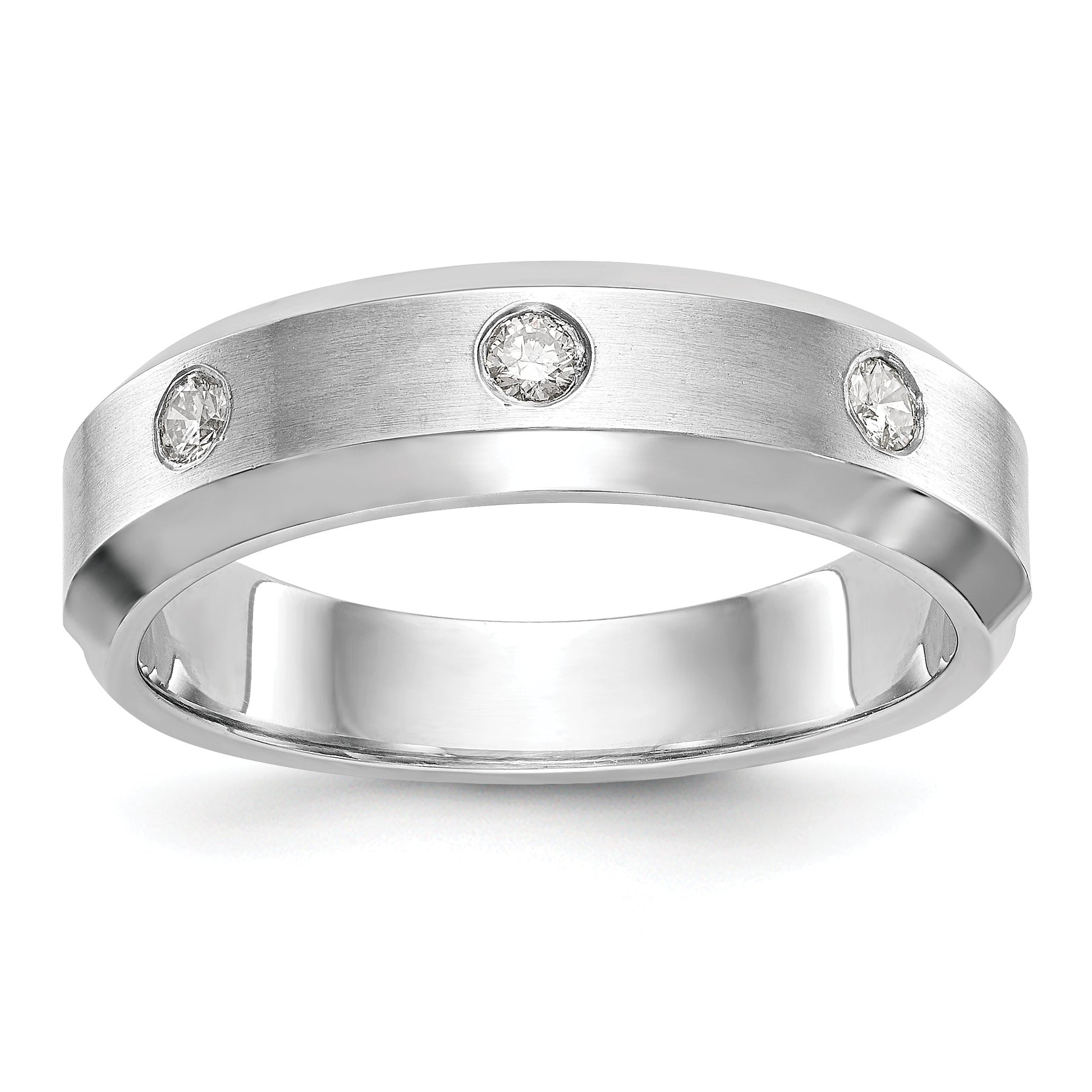 This ring has a polished and brushed finish, three CZ stones, and a plating of rhodium. The band width is tapered from 5.9 to 4.2mm, and it has a size range from 9 to 11 with a sizing adjustment increment of 0.25. It is sold by unit and is not recommended for engraving. The ring is complete with all stones included, and the stone shape is round with a size of 2.3mm. The thickness of the ring is less than 2mm, and it features a closed back. The stone creation method is synthetic, and the stone color grade is G-H-I.