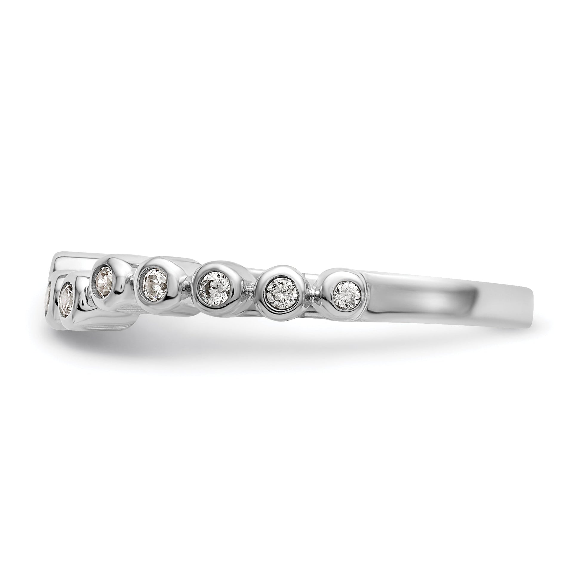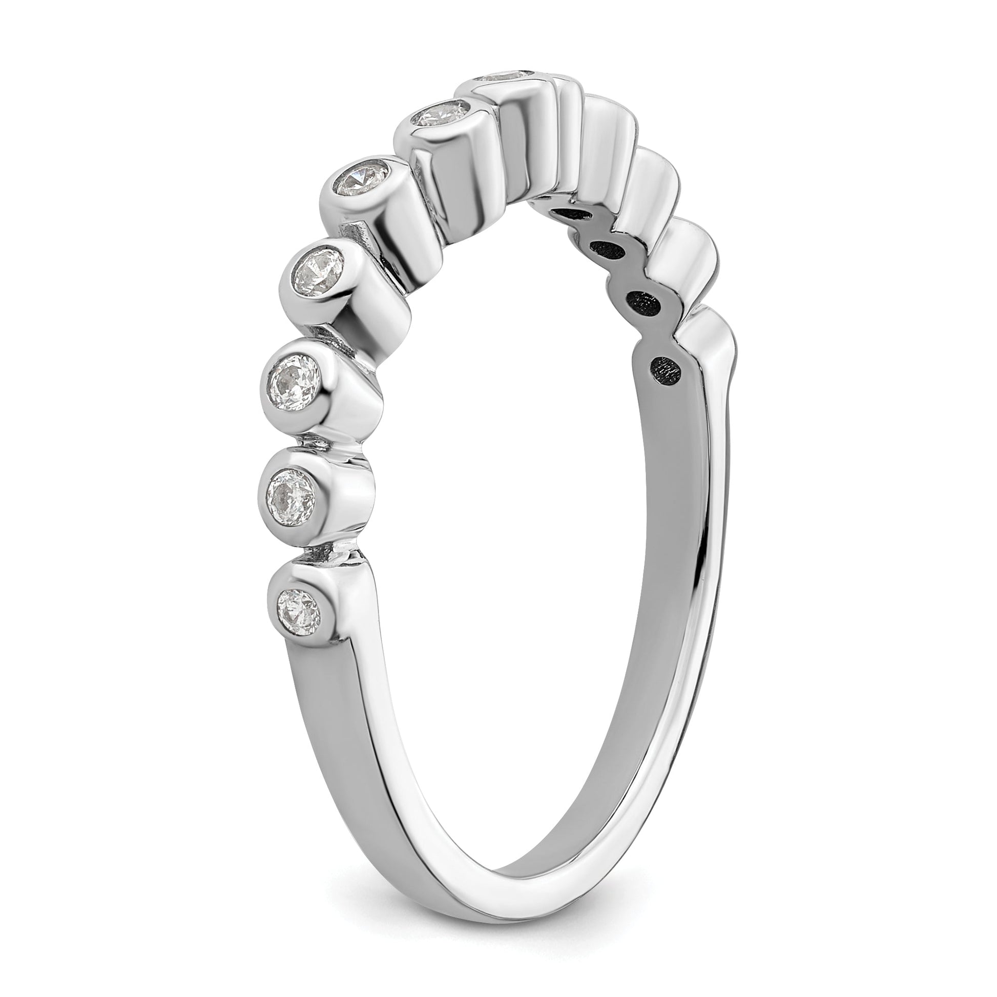 The ring features 12 CZ (Cubic Zirconium) stones in a Rhodium plating with a polished finish. It has a band width of 1.3 to 2.7mm (tapered) with a thickness of less than 1.5mm. The stones are round in shape with a size of 2mm each. The ring is complete (all stones included) and sizeable. It's a solid ring that's casted for excellent quality. The profile is open back, and it's intended for women's use. The ring type is a wedding band, and the stones are created synthetically.