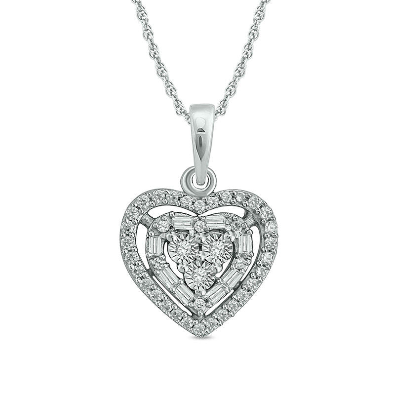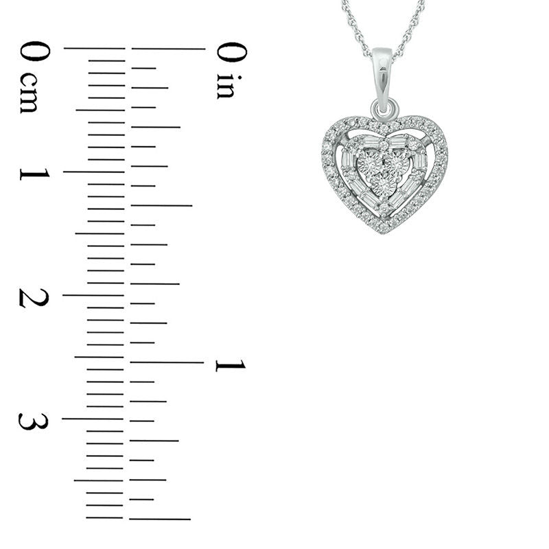 0.17 CT. T.W. Baguette and Round Natural Diamond Heart Frame Pendant in 10K White Gold
