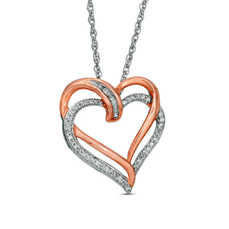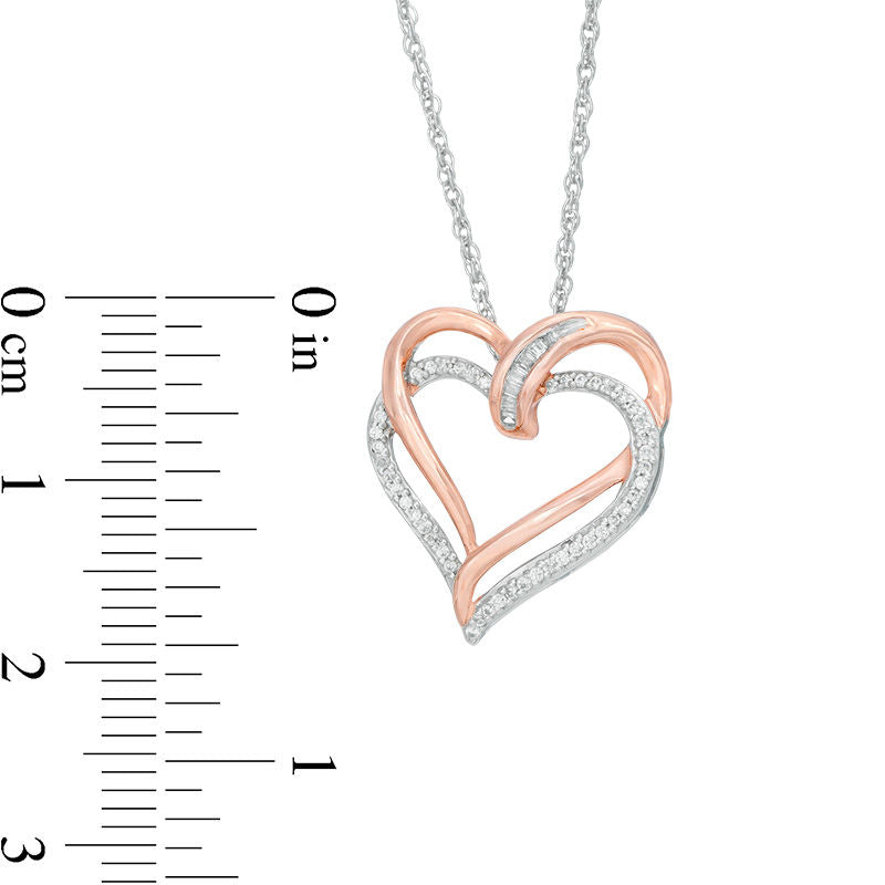 0.17 CT. T.W. Baguette and Round Natural Diamond Tilted Double Heart Pendant in Sterling Silver with 14K Rose Gold Plate
