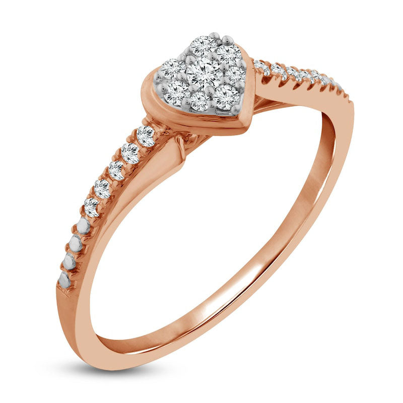 Surprise your loved one with this beautiful diamond promise ring that is sure to make her feel loved and special. Made from stunning 10K rose gold, this ring features a heart-shaped design made up of sparkling diamonds. The tapered ribbons adorned with additional diamonds create a unique look. With a total of 1/6 ct. t.w. of diamonds and a polished shine, this ring is the perfect symbol of your love story.