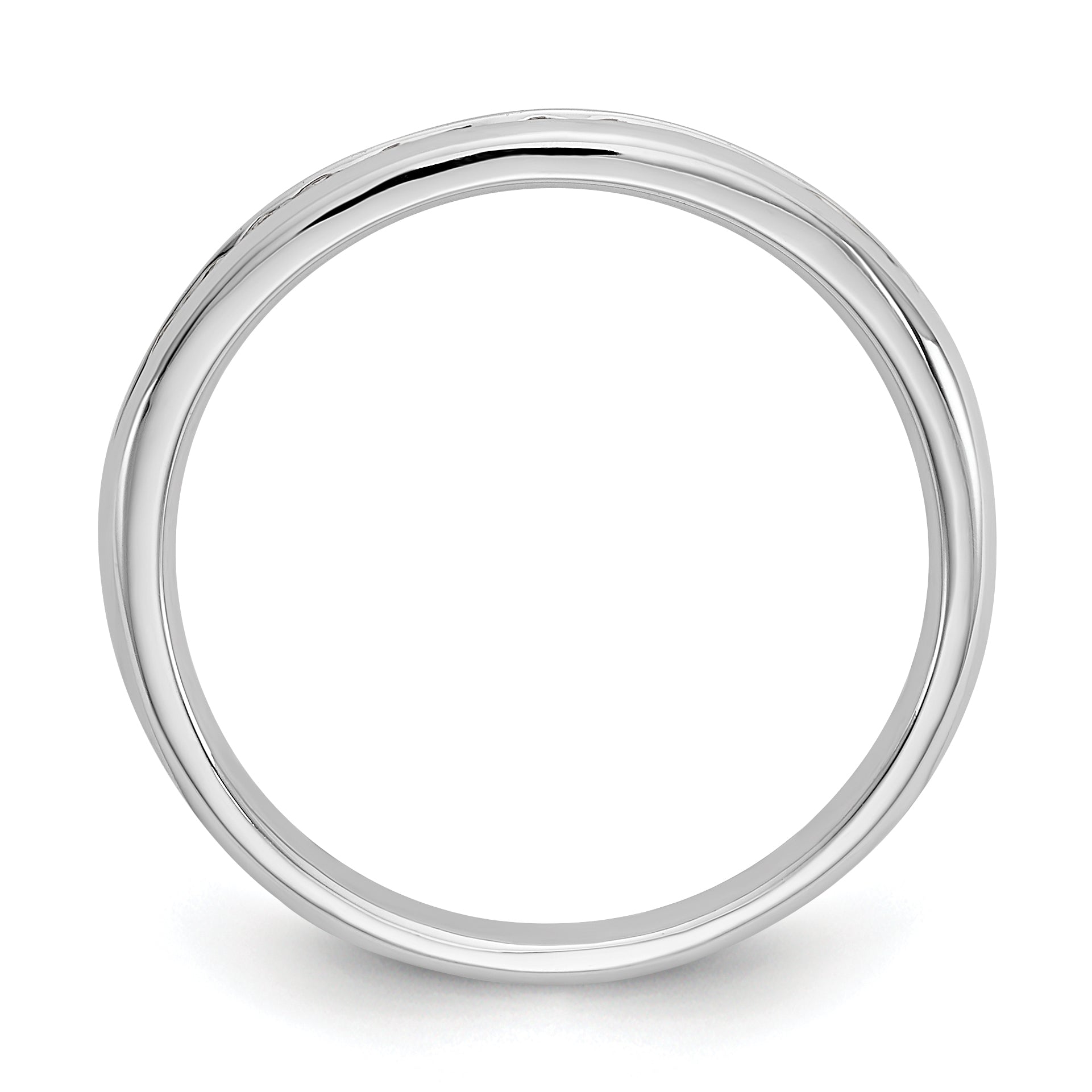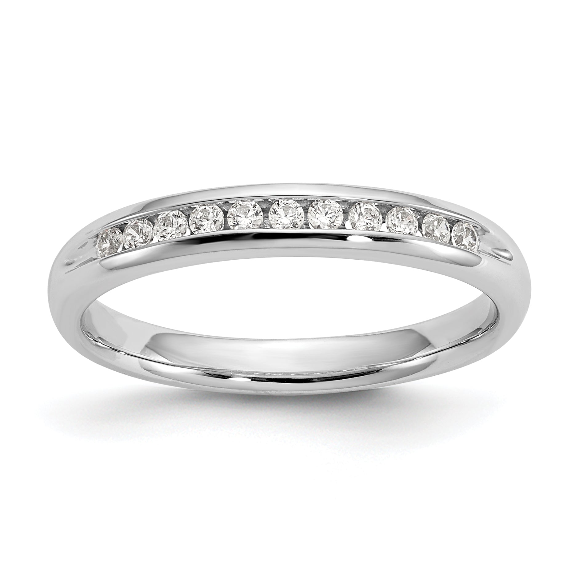 This is a wedding band ring made of real 14k white gold with 11 hand-set, high quality cubic zirconia stones. It is polished and has a tapered band width. It comes in a gift box and has a 30-day money-back guarantee. It can also be upgraded to natural diamonds for an additional cost. It is perfect for special occasions or everyday wear. It is made by a USA-based company that prides themselves on customer service.