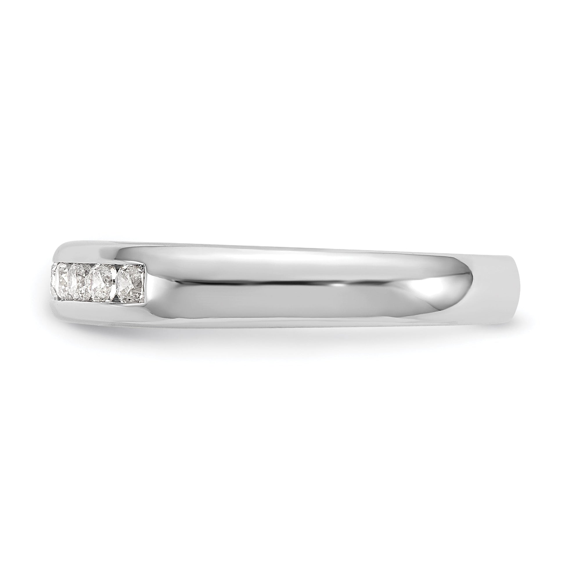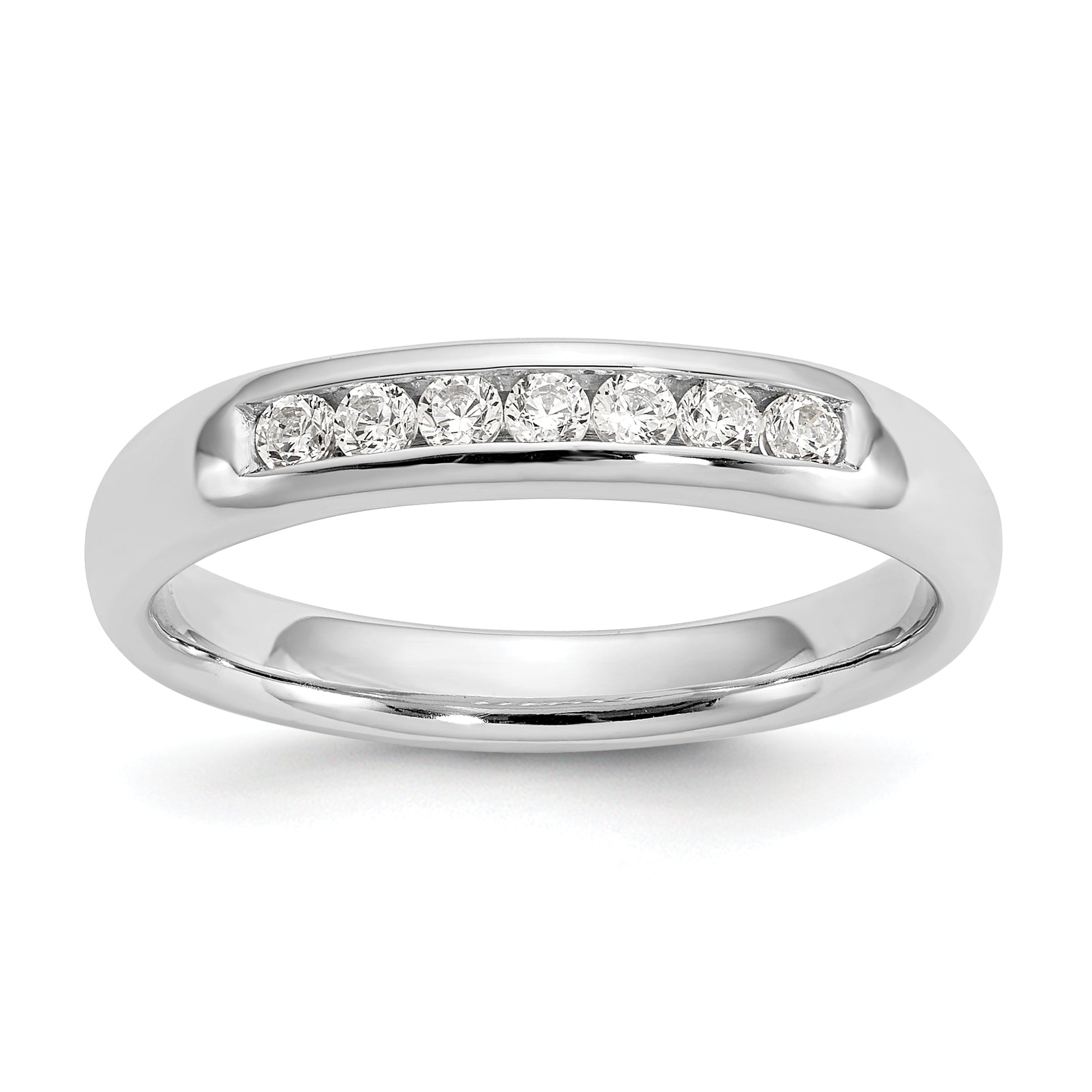 This ring has a polished finish, with 7 CZ stones weighing a total of 0.20 ct. The band is rhodium plated and has a width of 3.1 mm. The stones have a clarity of I1 (AA) and a color grade of G-H-I. The ring is sizeable, with a sizing adjustment increment of 0.25. It is complete with all stones included and has a thickness of less than 1.5 mm. This ring is sold by the unit and is a beautiful addition to any jewelry collection.