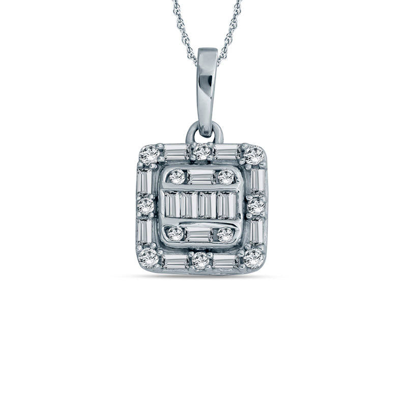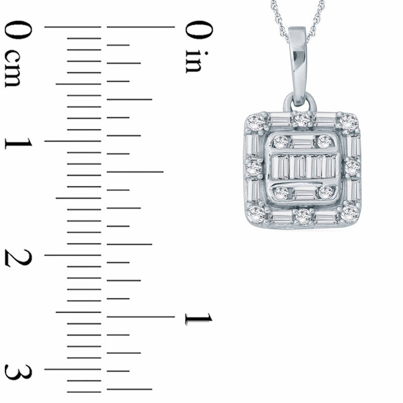 0.25 CT. T.W. Baguette and Round Natural Diamond Cushion Frame Pendant in 10K White Gold