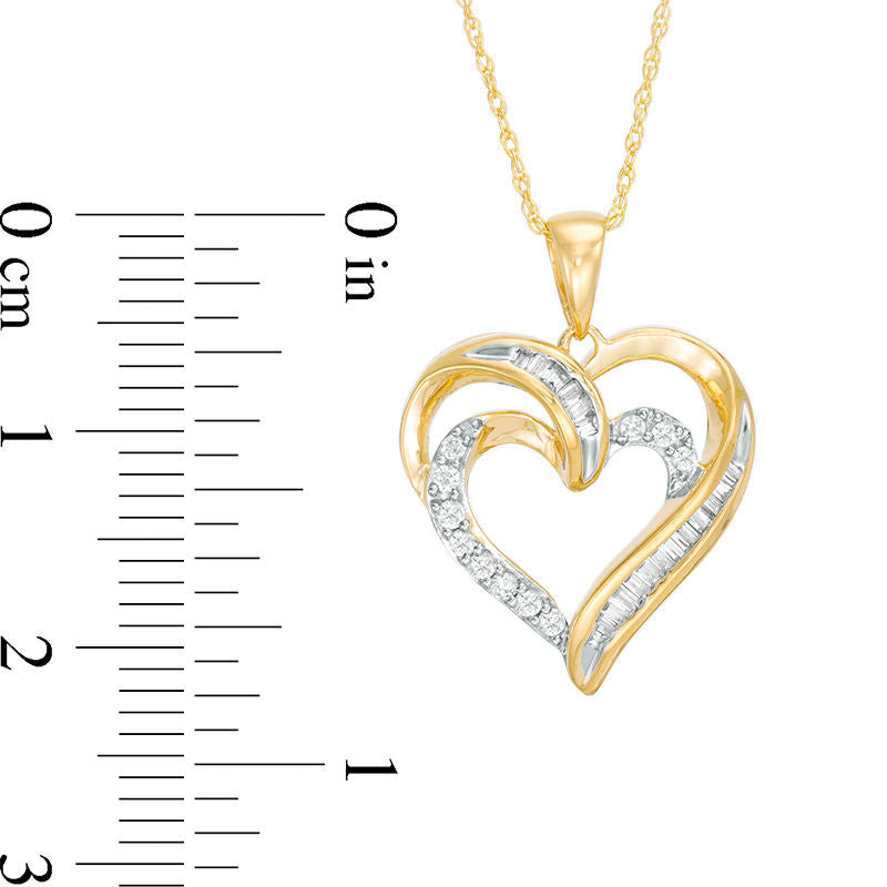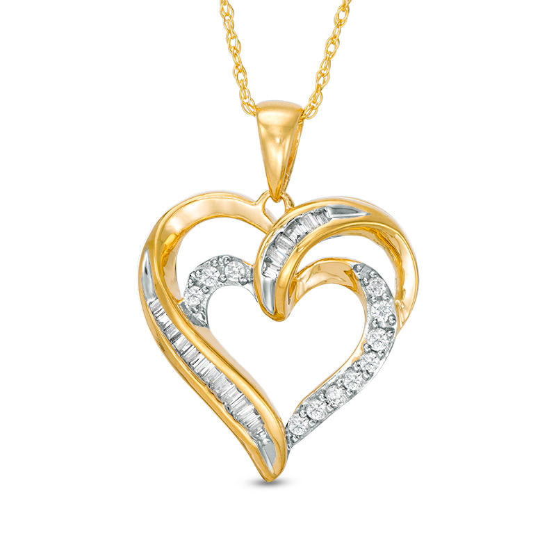 0.25 CT. T.W. Baguette and Round Natural Diamond Double Heart Pendant in 10K Yellow Gold