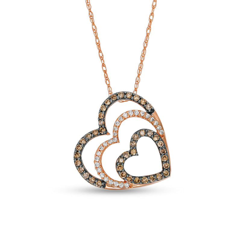 0.25 CT. T.W. Champagne and White Natural Diamond Tilted Hearts Pendant in 10K Rose Gold