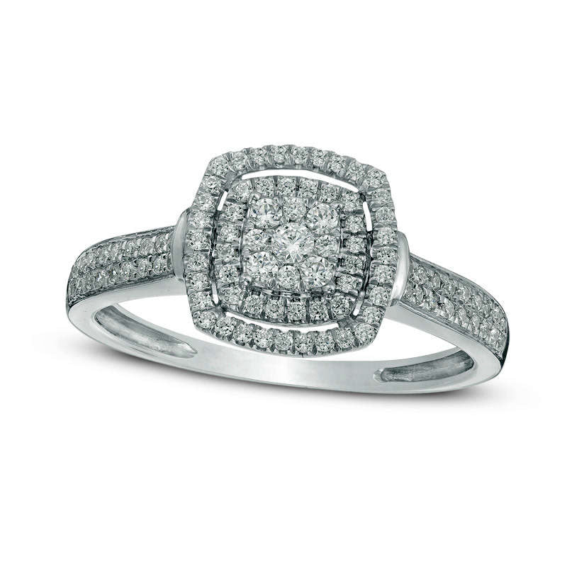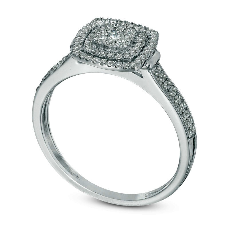 This engagement ring is a stunning declaration of your love, designed in 10K white gold. The center of the ring is adorned with a square composite of round diamonds, brilliantly sparkling with a double halo frame of smaller accent diamonds. The ring shank is also lined with diamonds, and the whole piece features 1/4 ct. t.w. of diamonds. It has a comfortable fit and shines with a polished finish, making it a magical and everlasting symbol of your commitment.