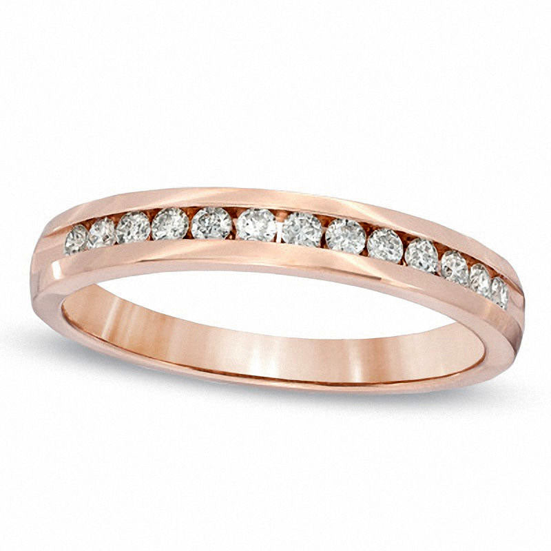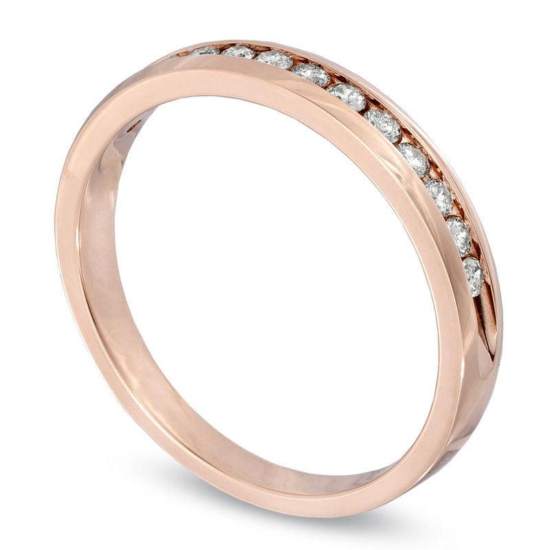 Make any special occasion even more memorable with this stunning 1/4 CT. T.W. Diamond Anniversary Band crafted in exquisite 14K Rose Gold. Whether you're commemorating your marriage, celebrating an anniversary or simply expressing your love, this dazzling diamond ring will surely make her feel special. The band features perfectly channel-set round diamonds, giving it an elegant, symmetrical look. Boasting 1/4 ct. t.w. of shimmering diamonds, this band is finished with a bright polished shine that exudes sophistication. Furthermore, the inside of the ring is rounded to provide maximum comfort. Order now and make your loved one's day even more special with this gorgeous diamond anniversary band.