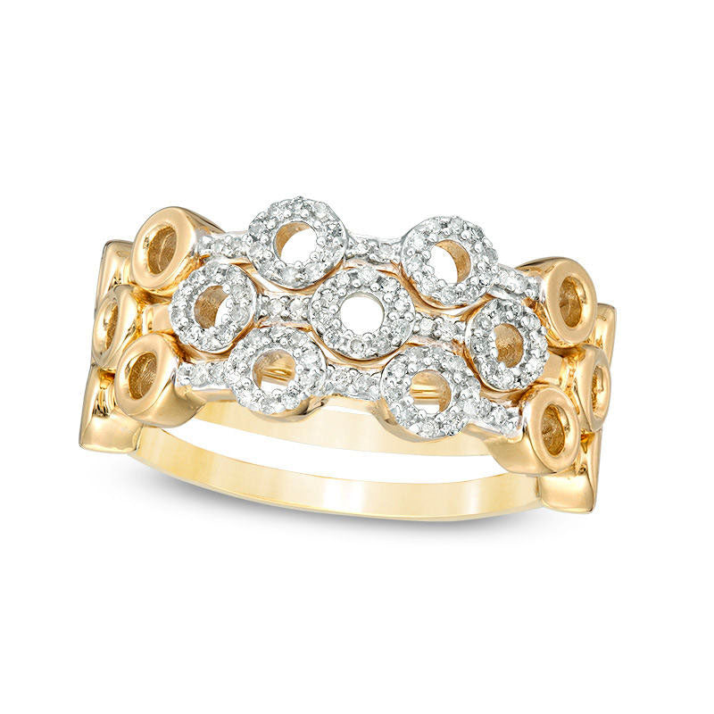 Add some sparkle to any occasion with this stunning 1/4 CT. T.W. Diamond Circle Outline Three Piece Stackable Band Set. Made with durable sterling silver and finished with a gorgeous 14K gold plate, these rings feature a trio of beautifully crafted bands that each boast diamond-lined and polished open circles as well as diamond connecting bars. Whether stacked together for a fully layered look or worn separately for a more understated style, these rings are sure to impress. With a total diamond weight of 1/4 ct. and a brilliant buffed luster, this comfort-fit band set is the perfect addition to any jewelry collection. Custom-made to fit her ring size, these sterling silver rings cannot be resized after purchase.