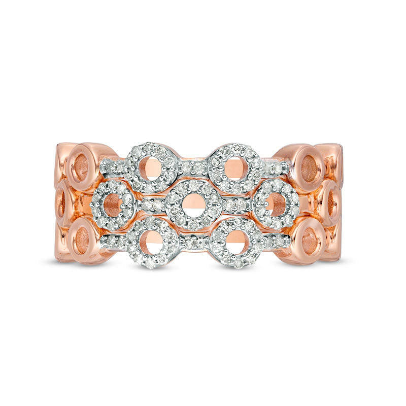 The '1/4 CT. T.W. Diamond Circle Outline Three Piece Stackable Band Set in Sterling Silver with 14K Rose Gold Plate' is a stylish accessory that seamlessly takes her from day...