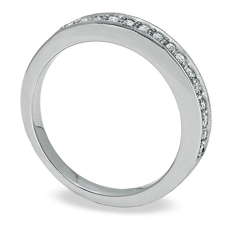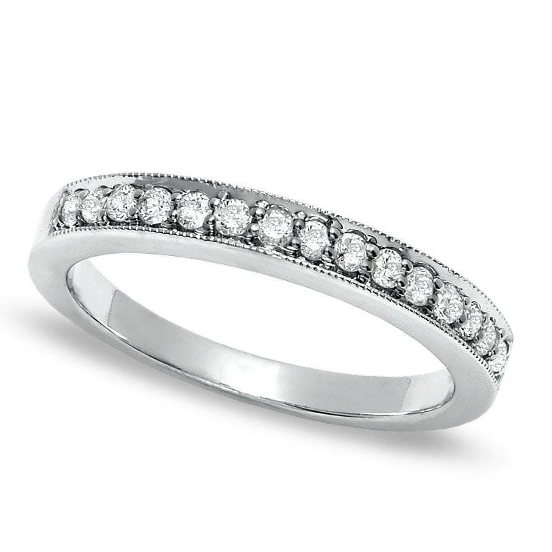 Looking for a magnificent gift to give to that special someone? Give them the gift that sparkles with brilliance - a 1/4 CT. T.W. Diamond Stackable Band in 14K White Gold. Perfect for weddings, anniversaries, or just because, this band is an exquisite choice that is sure to leave a lasting impression. Adorned with round prong-set diamonds totaling 1/4 ct., they glisten beautifully against a textured milgrain edging that creates a stunning look that is truly one-of-a-kind. Treat the one you love to a gift that they will treasure forever, with this awe-inspiring diamond band.