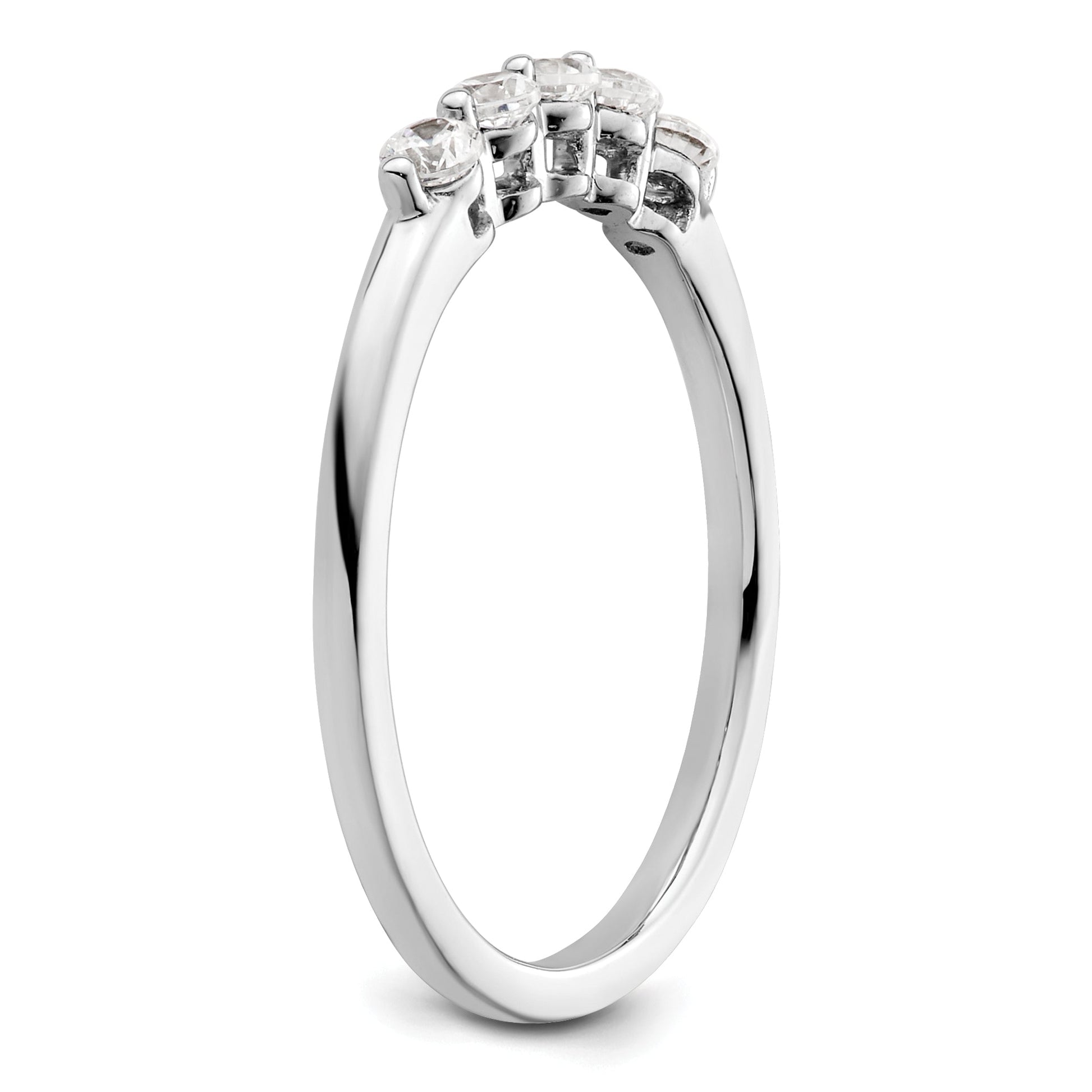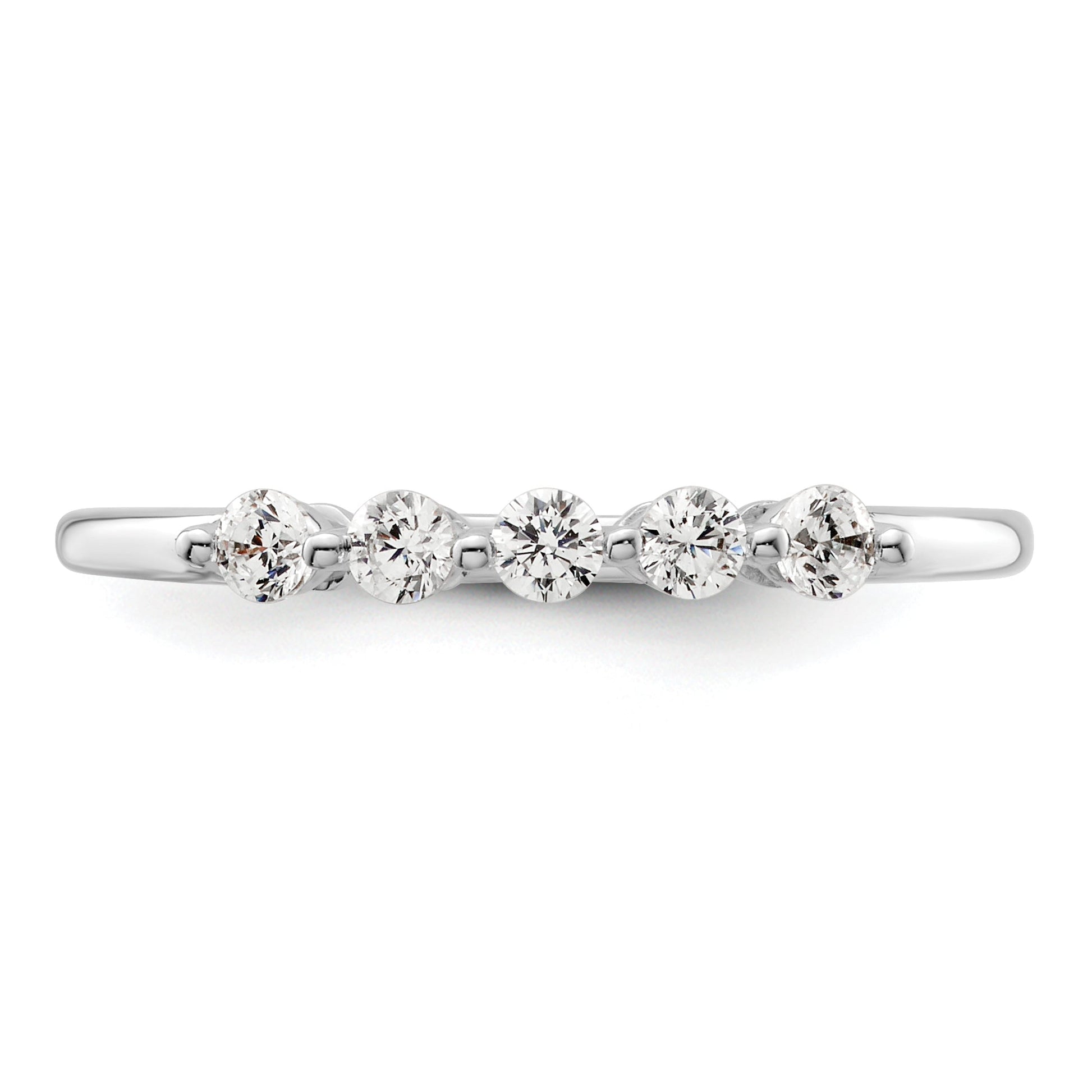 This is a wedding band ring made of real 14K white gold, featuring five high-quality cubic zirconia stones that are hand-set by experienced jewelers. The ring is polished for a shiny finish and is rhodium plated to prevent discoloration. It can also be made with natural diamonds, upon request. It comes in a gift box and has a 30-day money-back guarantee. This beautiful ring is perfect for weddings, anniversaries, and other special occasions.