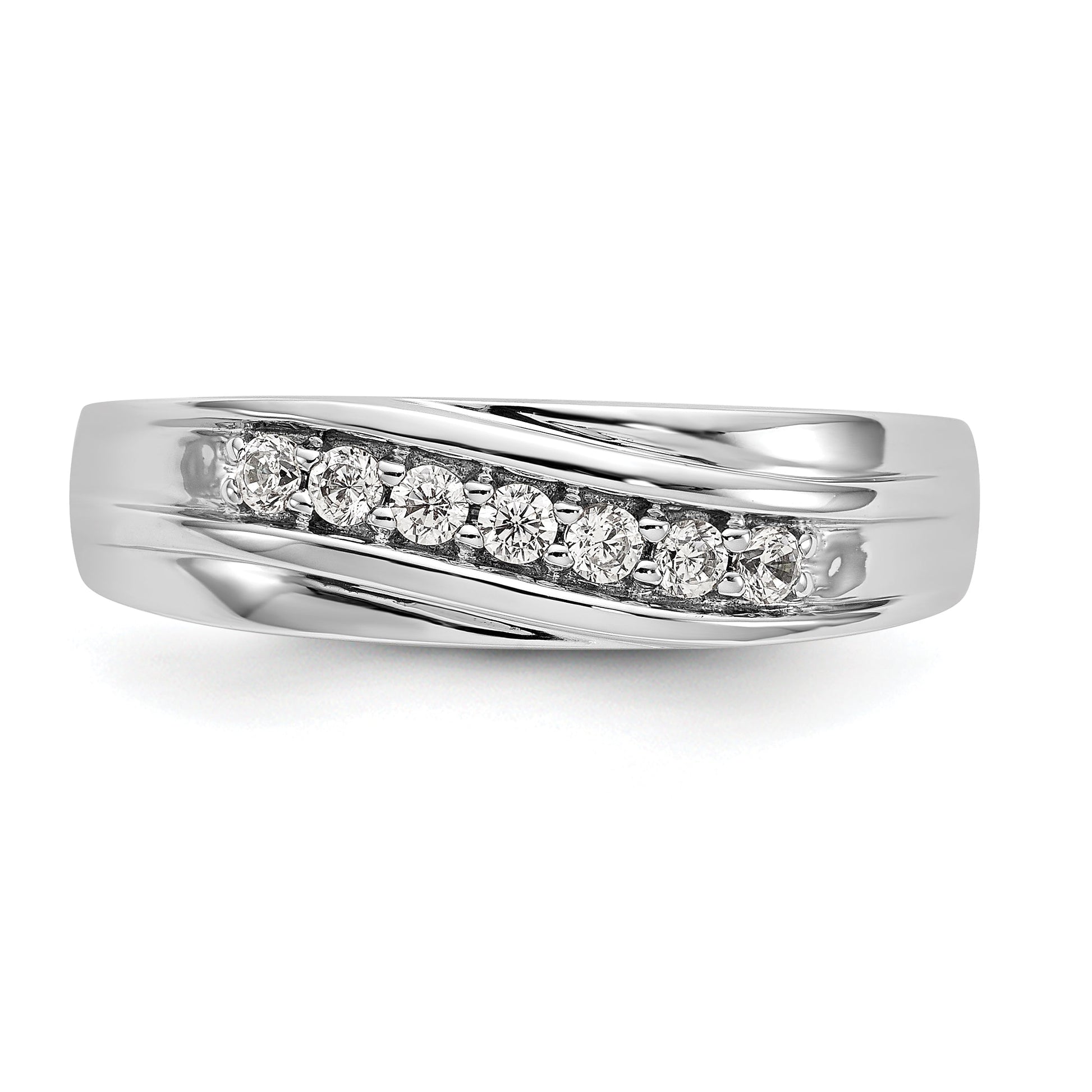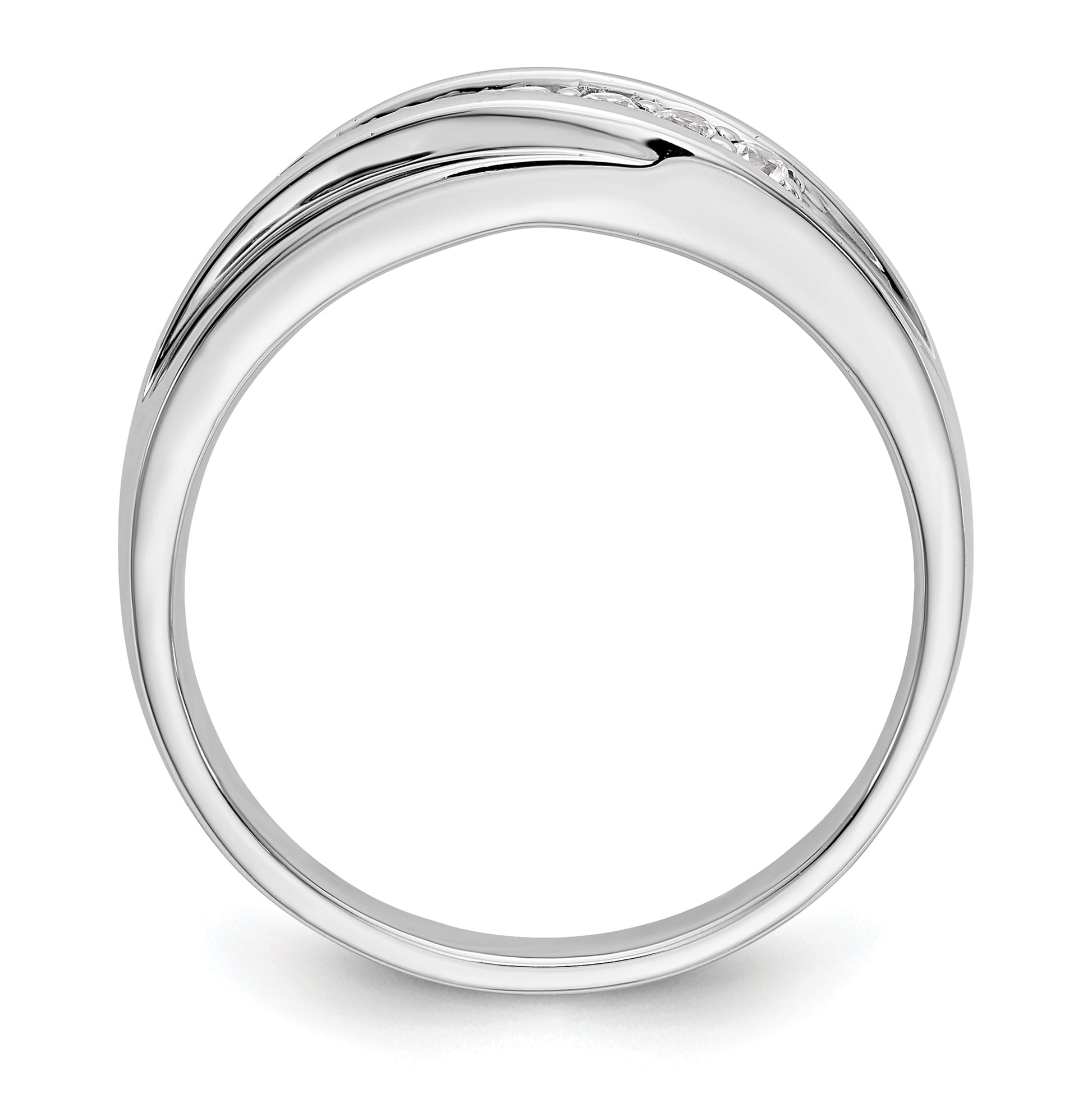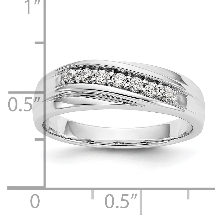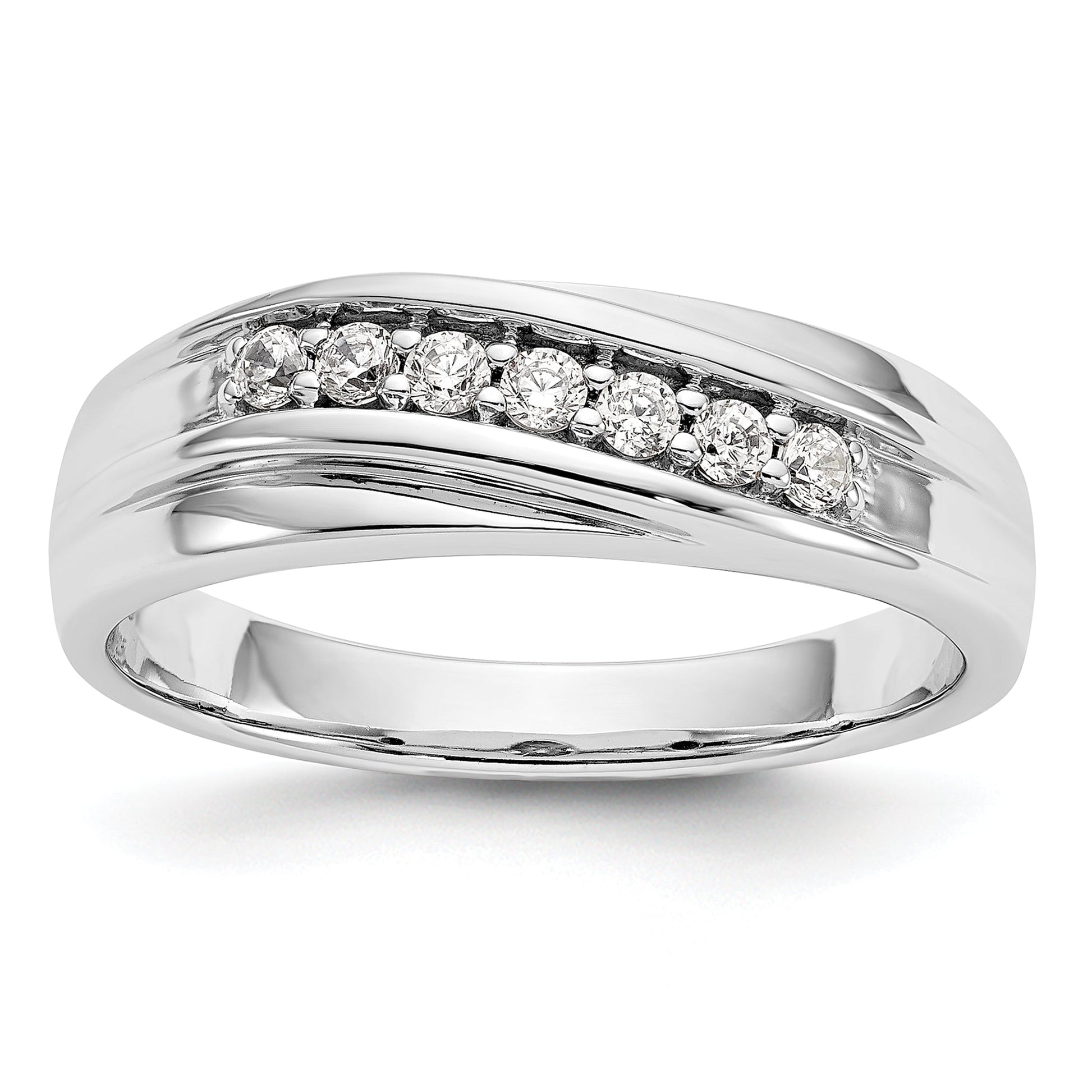 This ring is also available in yellow and rose gold for the same price. The Rhodium plating gives it a lustrous finish. This ring fits sizes 9 to 11 and is sizeable in increments of 0.25. The stone shape is round, and the stone size is 2 mm. Choose this ring as an elegant and timeless symbol of your commitment.