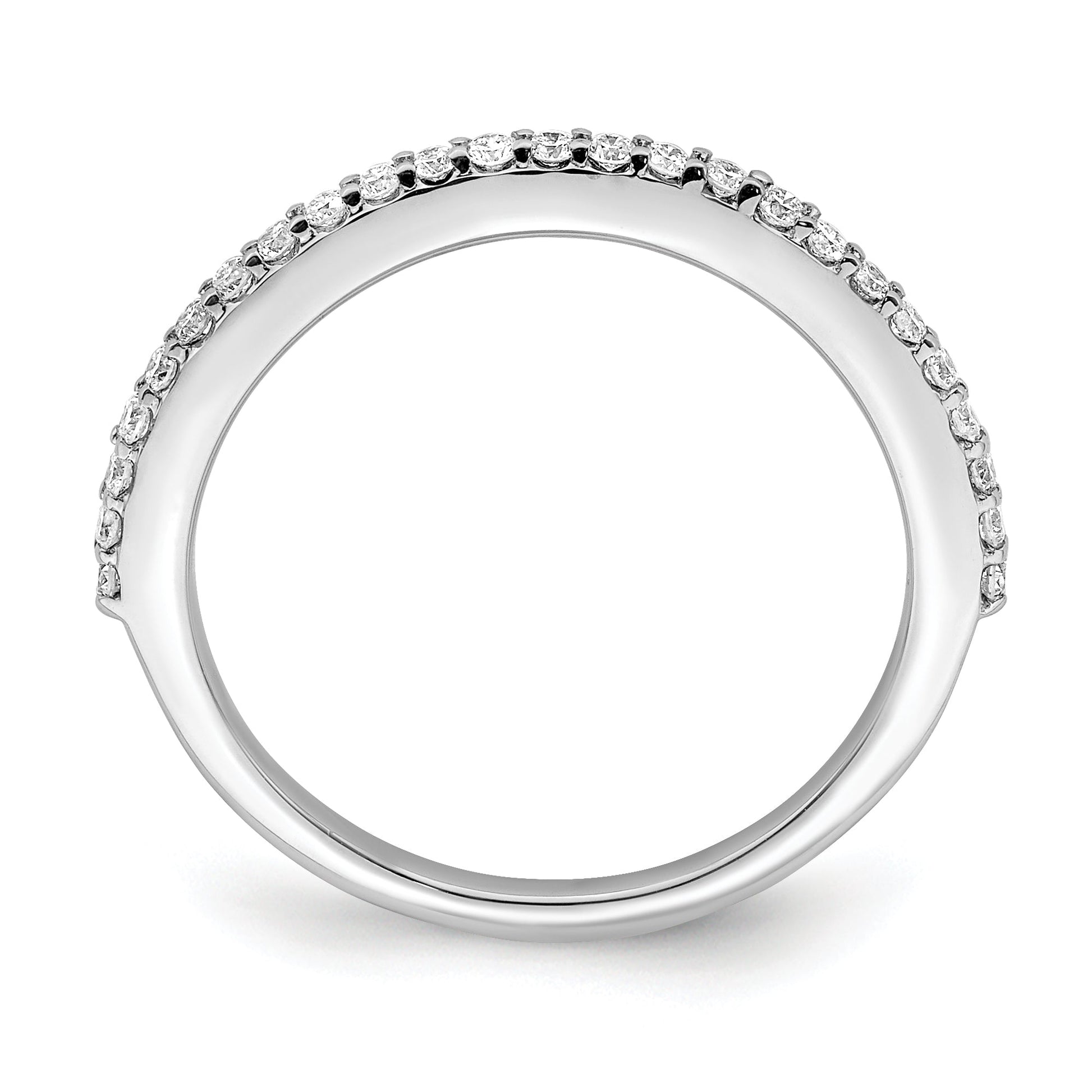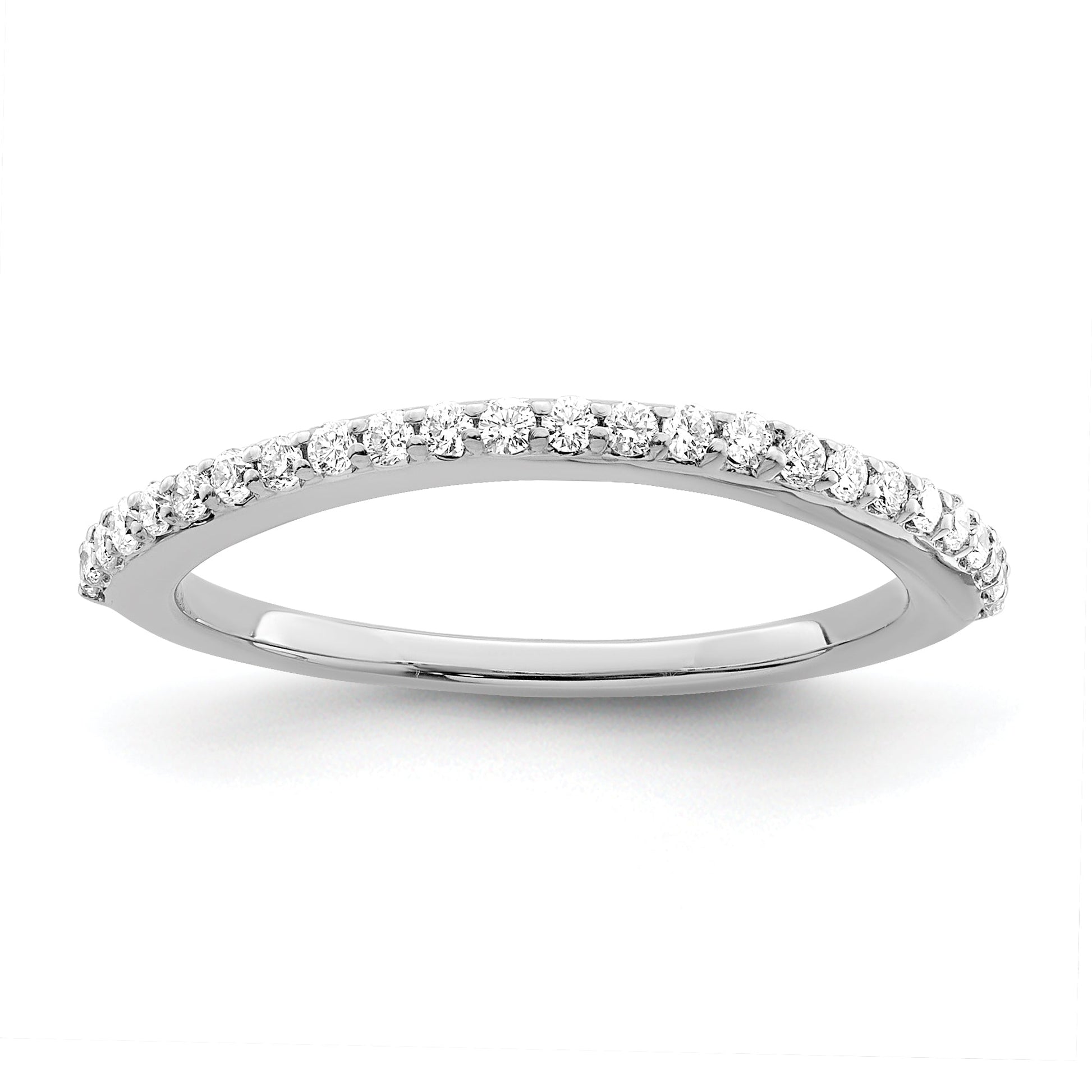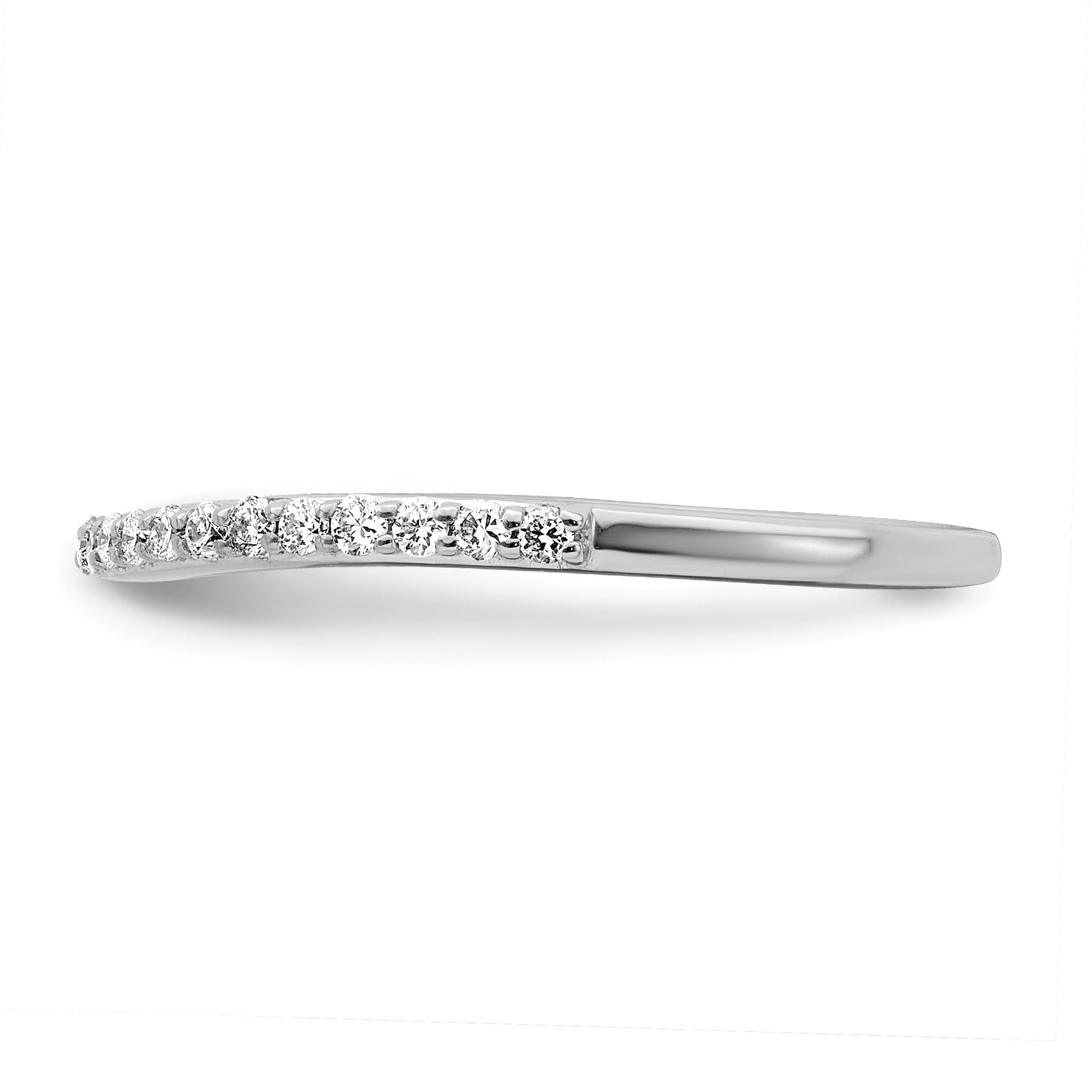This wedding band ring is complete with all stones included and is sizeable, making it easy to wear comfortably. The open-back design and tapered band width of 1.6 to 1.5 mm add sophistication and flair. The ring features 25 round-shaped cubic zirconia stones with a 0.01 ct weight and I1 (AA) clarity.