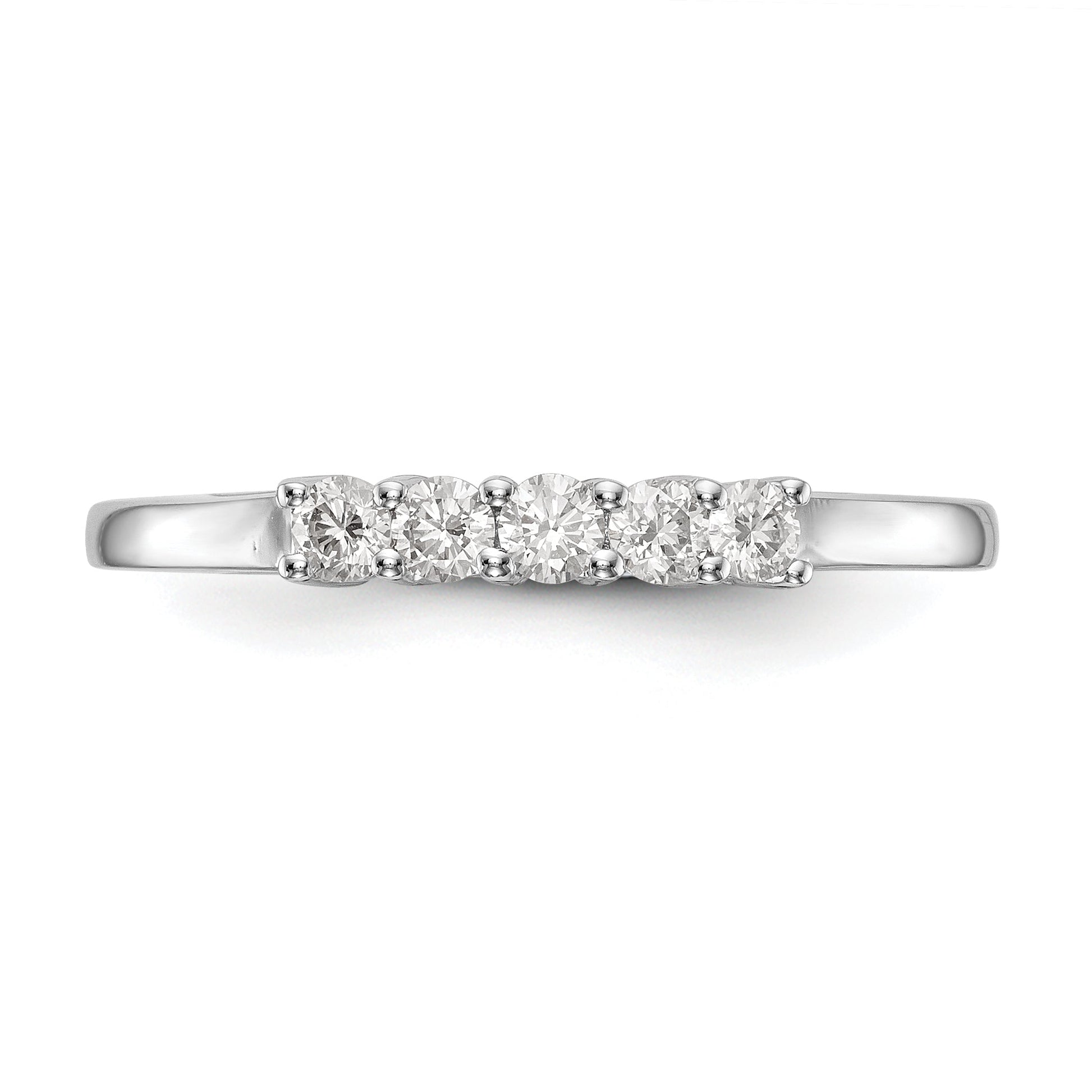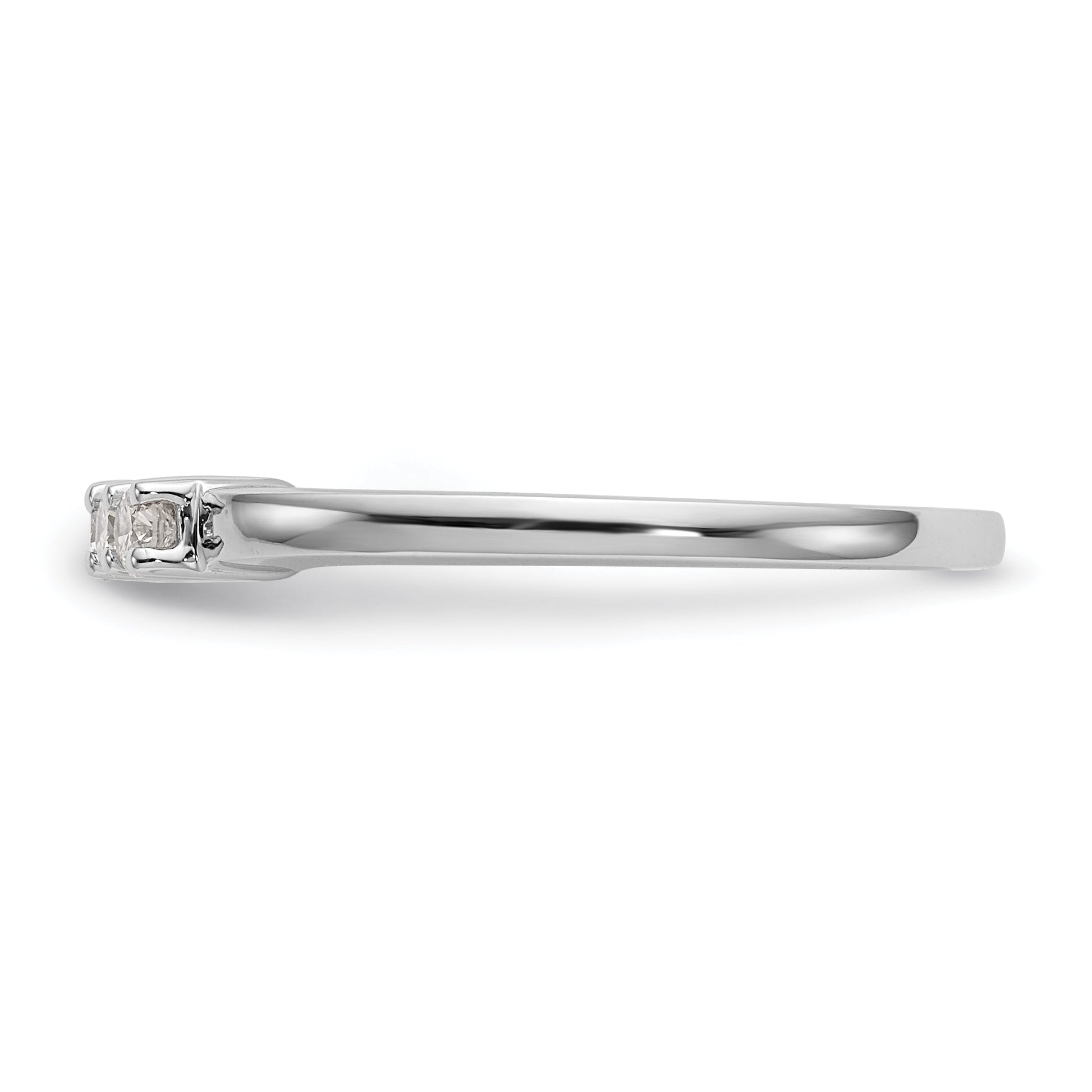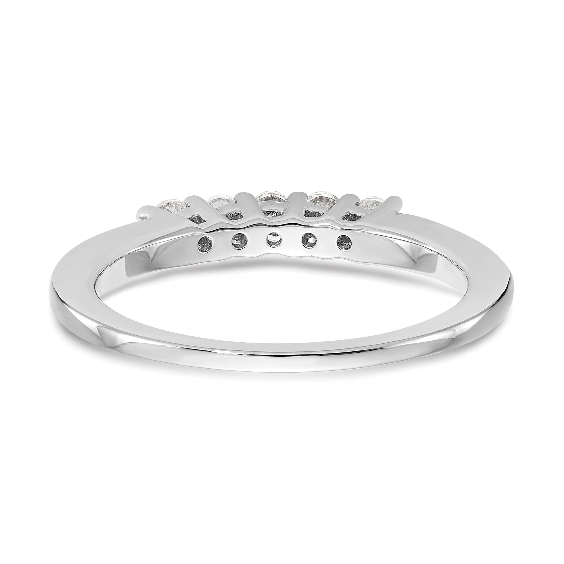Featuring 5 CZ stones with a total weight of 0.05ct, this ring has a polished finish and is rhodium plated for added durability. The tapering band has a width of 1.36 to 1.71mm and a head height of 2.44mm. It can be adjusted in size in increments of 0.25, with a minimum size of 6 and maximum size of 8. This complete ring is elegant, affordable, and perfect for any special occasion.
