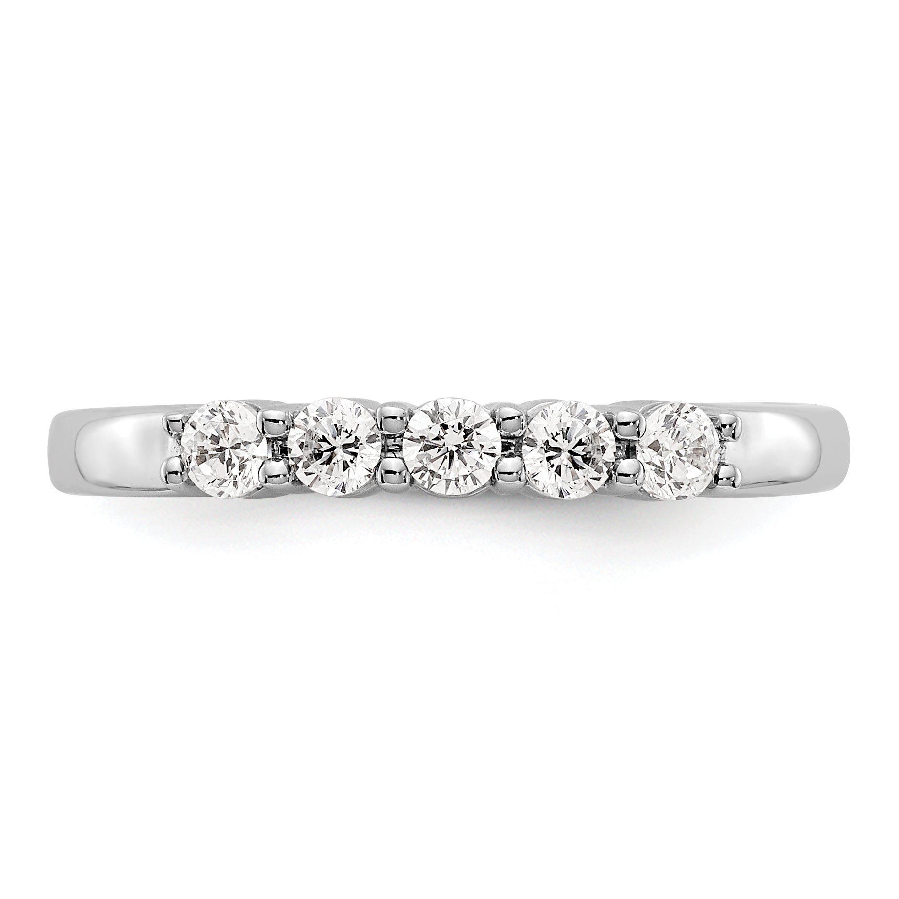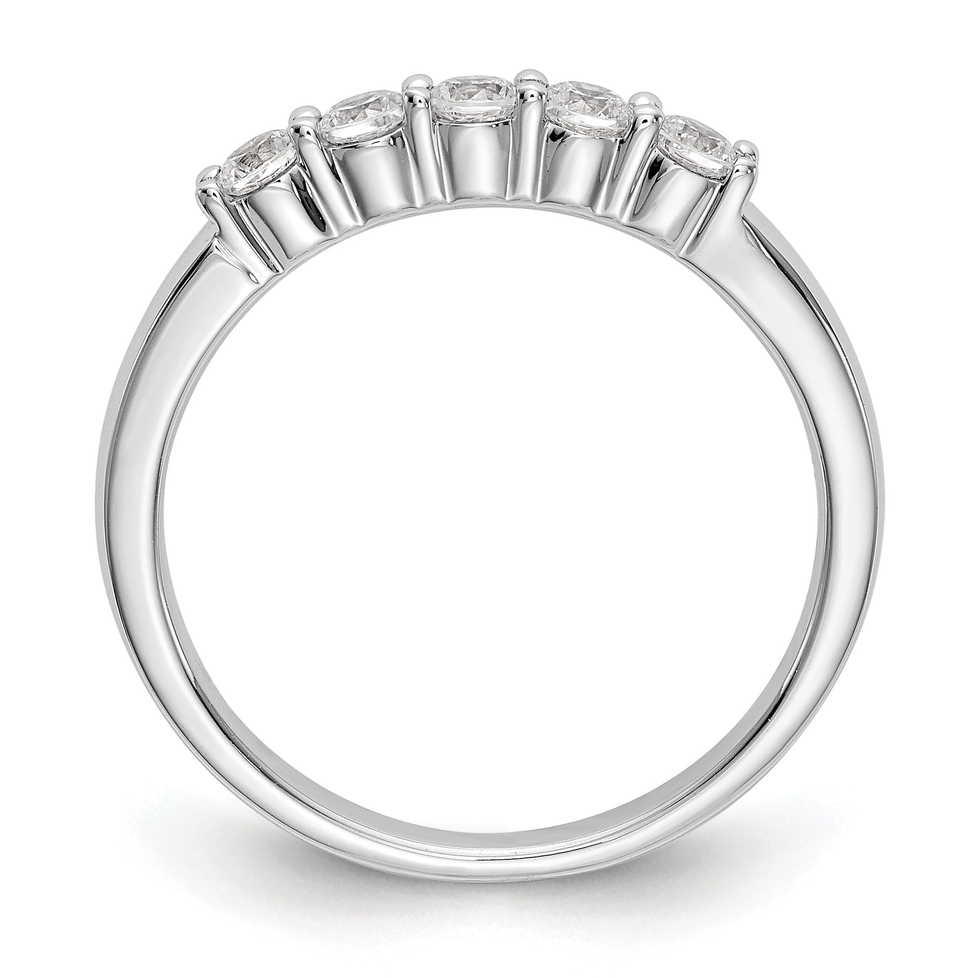This 14K gold wedding band ring has a polished finish and is plated with rhodium to enhance its durability. It has a band width of 2.3 to 2 mm (tapered) and stone weight of 0.065 ct. The stone clarity is I1 (AA) and the stone color grade is G-H-I. It is complete with all stones included, sizeable, and can be of sizes 6 to 8 in increments of 0.25. The ring is not recommended for engraving and is sold as a single item. It is perfect for wedding bands and is closed back with synthetic stone creation method.