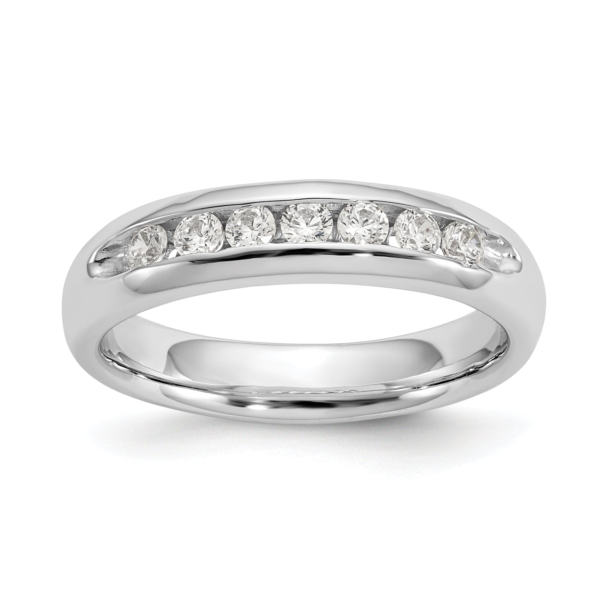 The band width tapers from 4.3 to 3.8 mm, and the stones are round and 2.2mm in size with a stone weight of 0.045ct. The ring is sizeable with a sizing adjustment increment of 0.25. It is complete with all stones included, though not recommended for engraving. The ring is a closed back design with rhodium plating to prevent oxidization and discoloration. Order yours today and experience the luxury of this beautiful ring.