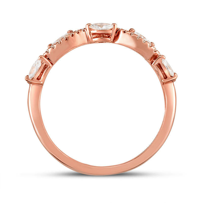 This stunning stackable ring is perfect for adding some sparkle to your outfit. Made from 14K rose gold, it features a wave design with round diamonds and marquise-shaped diamonds along the sides, creating a beautiful vine pattern. It has a total of 1/3 carat of diamonds and comes with a brilliant shine. This fashionable band is a great addition to your jewelry collection.
