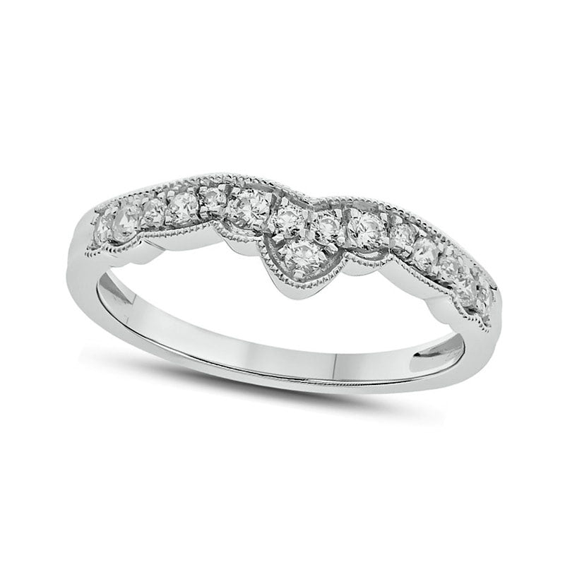 This stunning vintage-style diamond wedding band is the perfect gift for your special day. Crafted from lustrous 10K white gold, this band features a unique crown contour design embellished with a scalloped row of dazzling diamonds of various sizes, all delicately bordered by intricate milgrain detailing. Boasting a total diamond weight of 1/3 ct. t.w. and a spectacular shine, this band will complement your solitaire or other bridal jewelry beautifully. Say "I do" in style with this elegant and sophisticated wedding band.