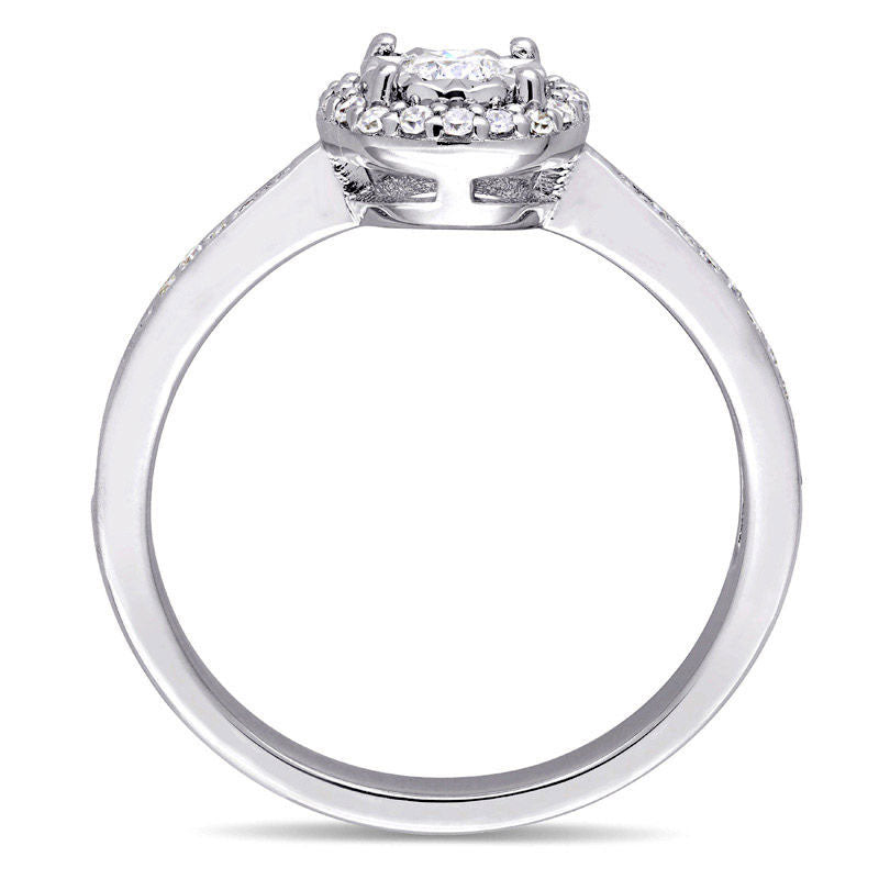 This stunning diamond engagement ring is sure to make her heart skip a beat. Made from high-quality sterling silver, the piece boasts a 1/6 ct. diamond center stone that has been expertly set to maximize its size and sparkle. The center stone is surrounded by a halo frame of smaller diamonds, which add to the ring's overall radiance. The shank of the ring has also been set with additional diamonds, making for a total weight of 1/3 ct. The ring has been finished to a brilliant buffed luster, ensuring it will sparkle beautifully in any light. The ring will be custom-made to fit her ring size, ensuring the perfect fit. Please note that sterling silver rings cannot be resized after purchase.