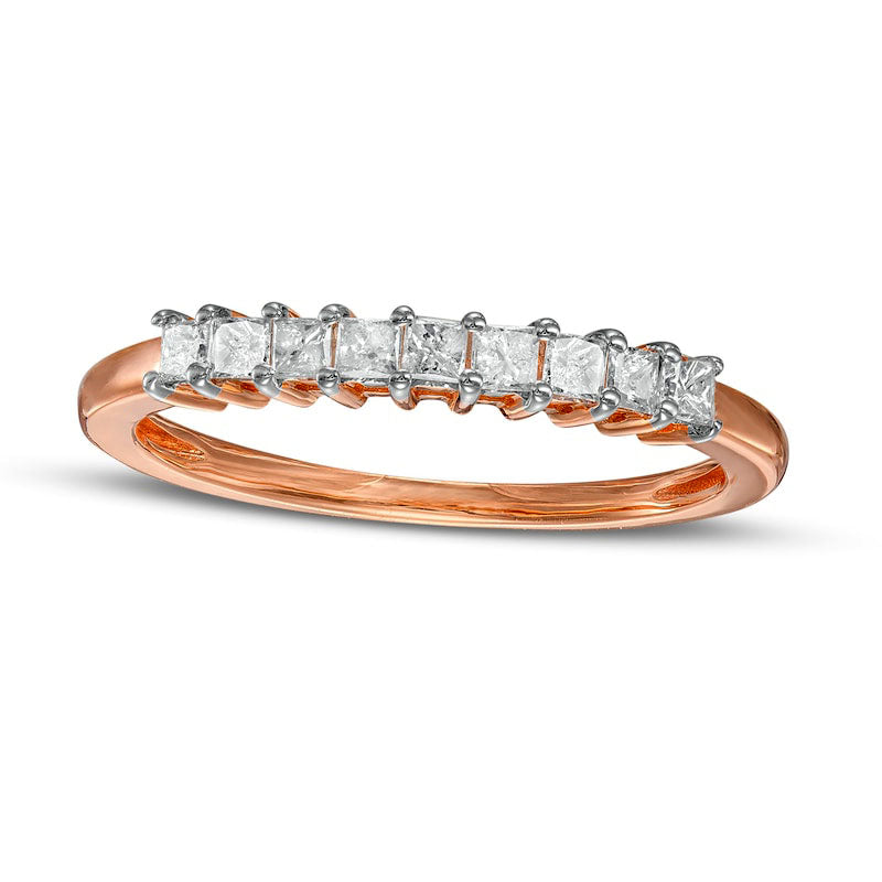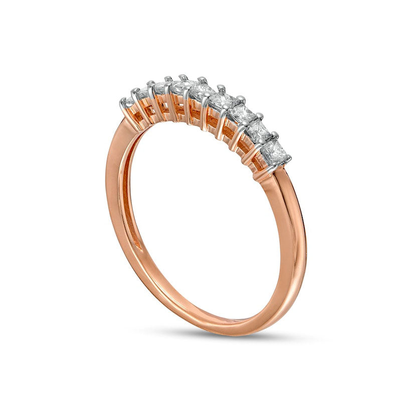 Celebrate your everlasting love with this stunning 10K rose gold anniversary band, featuring nine princess-cut diamonds that sparkle with brilliance. With a total weight of 1/3 ct. t.w., this gorgeous ring will captivate your heart and the hearts of those around you. Boasting a timeless design and polished shine, this beautiful band promises more cherished memories to come. Sophisticated and elegant, this is the perfect way to show your commitment and devotion to the one you love.