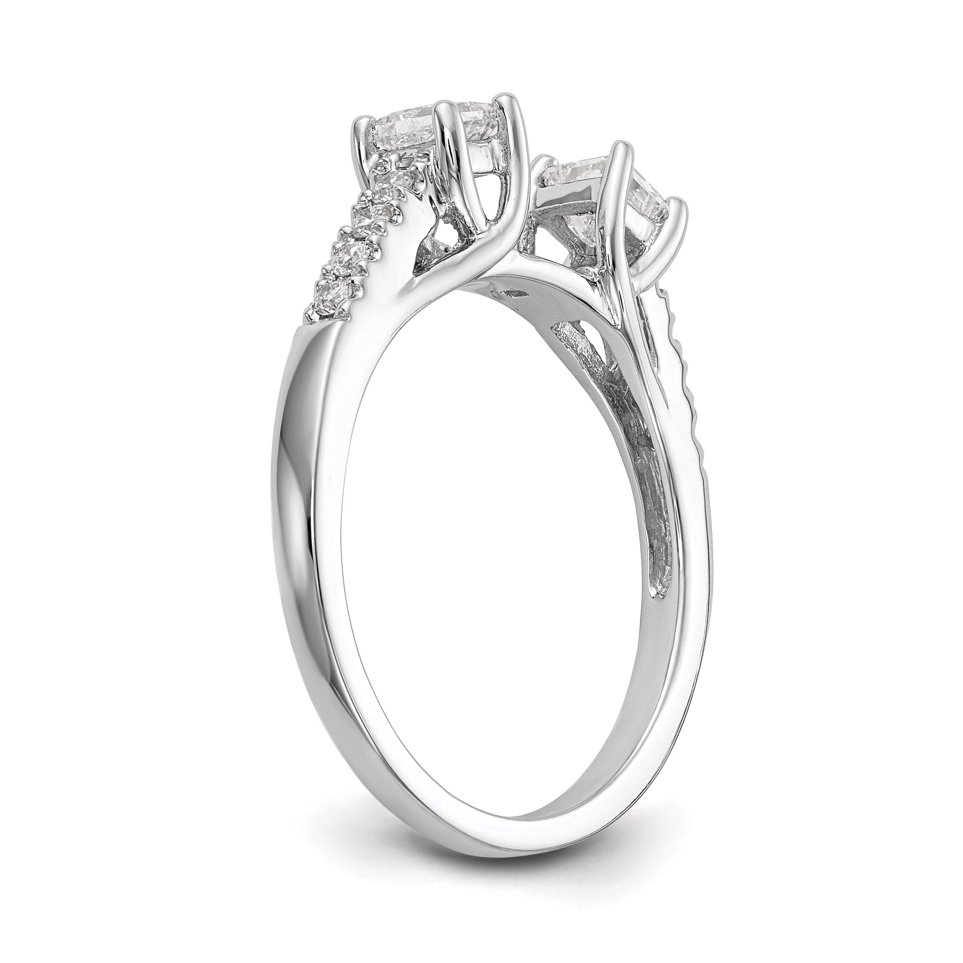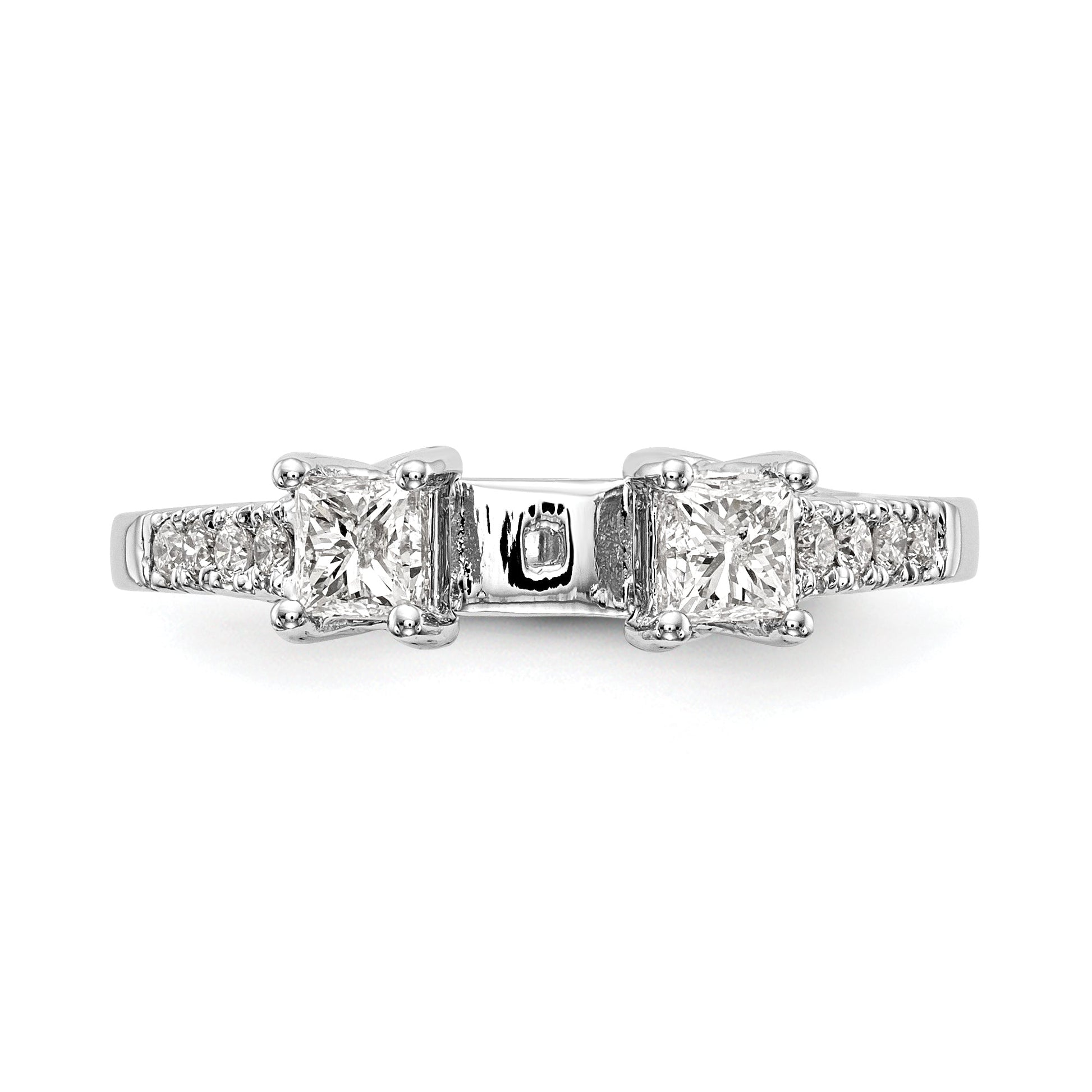 Featuring a polished finish, this ring showcases a square center stone mounting and two side stone mountings alongside four round cubic zirconia stones. With a band width that tapers from 2.01 to 2.38mm, this ring is complete with closed back and measures 5mm in head height. Made with semi-mount, center stones are not included but can be sized between 6 to 8 with increments of 0.25. Rhodium plating and unique rounded edge add durability and comfort. Stone weights include 0.5ct center stone, 0.2ct sides and four 0.0225ct round CZ stones. Stone sizes include 4.3mm and 3.3mm squares, 1.8mm and 1.7mm rounds. The manufacturing process of this ring is casted with solid gold. Make the moment extra special with this stunning piece of jewelry.