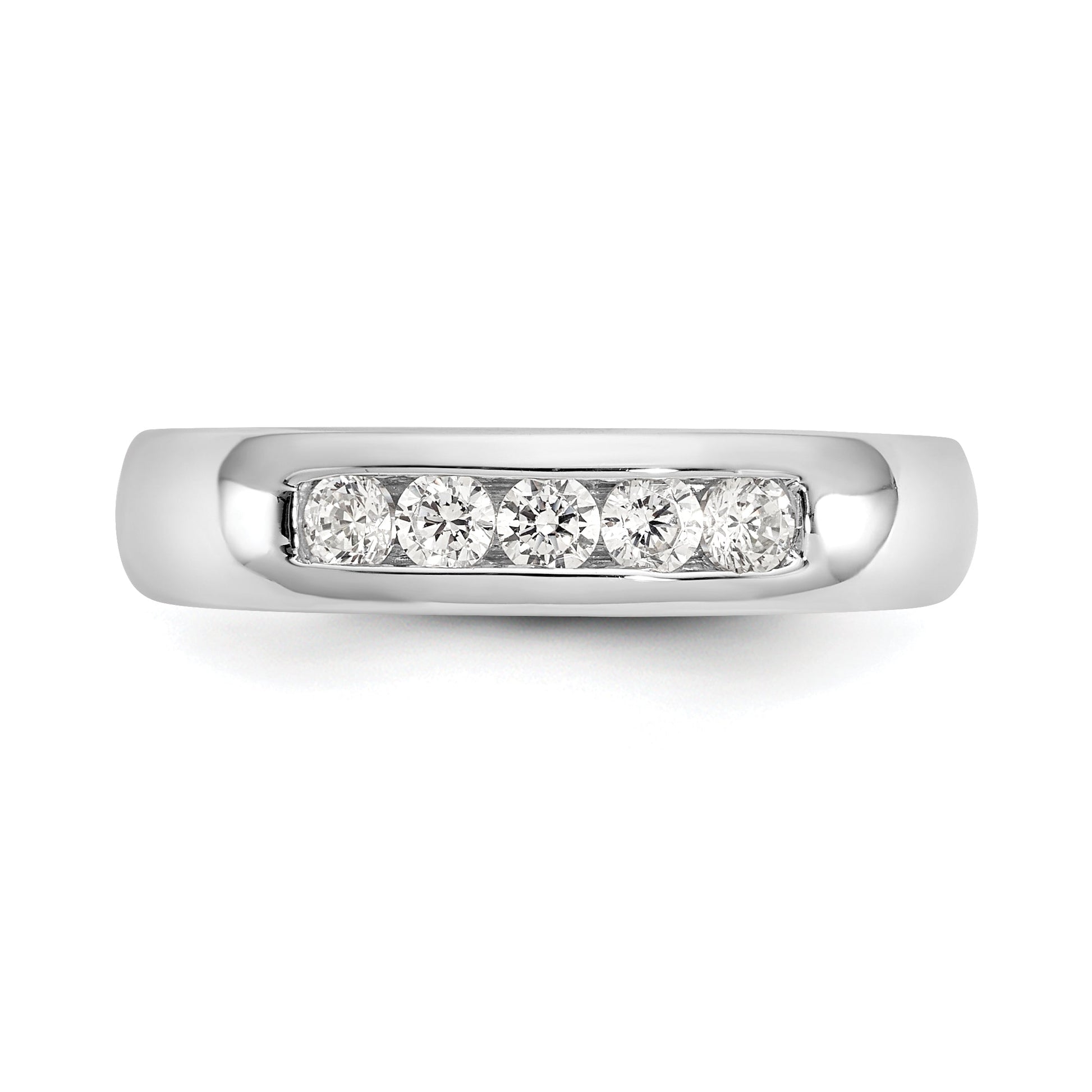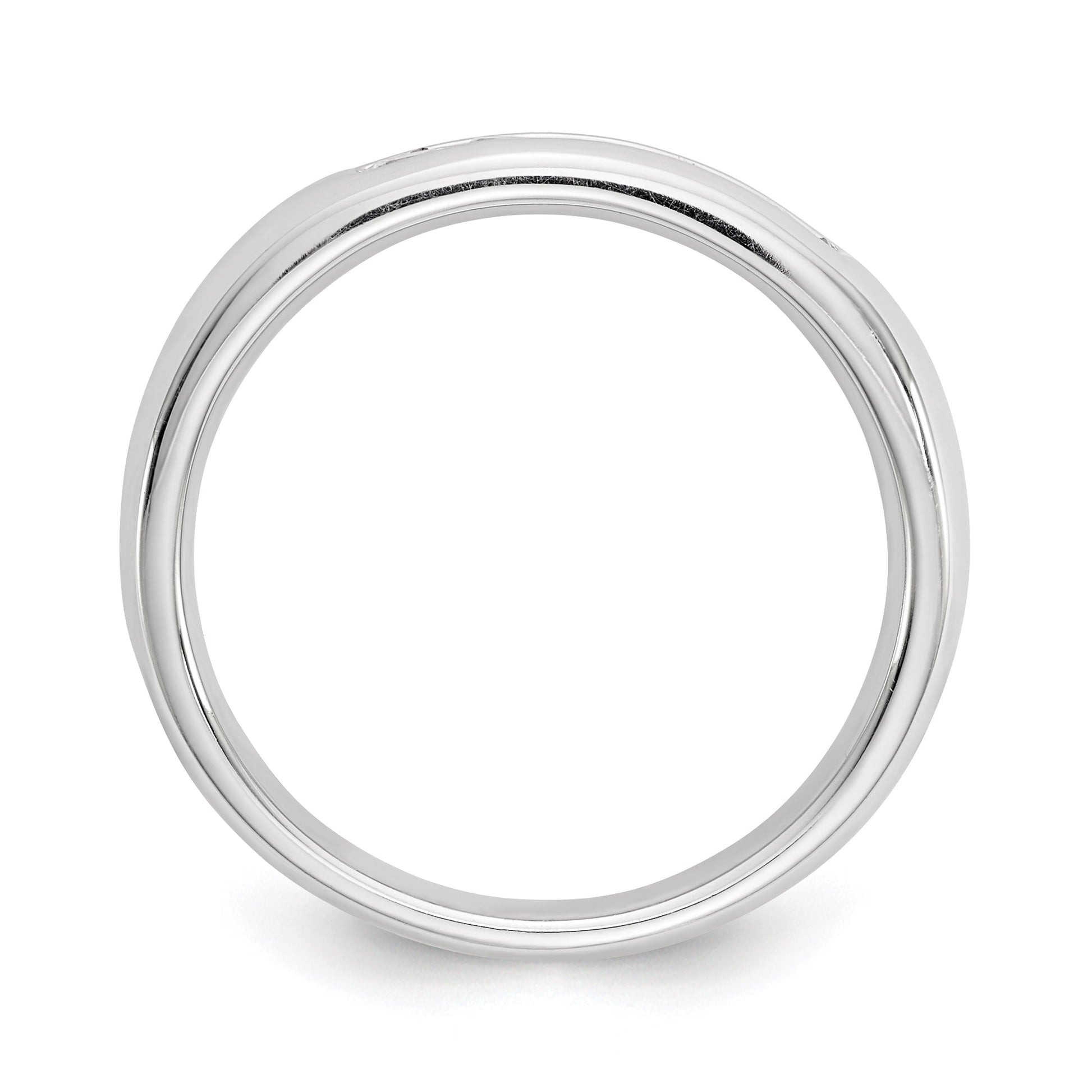 This ring is a perfect match for your wedding band or can be worn alone as a fashion statement. Its band width ranges from 4.6 to 3.7 mm, tapered, and has a shiny polished finish. Its size is adjustable, and it has five round-cut cubic zirconia stones mounted on it. We do not recommend engraving on this piece of jewelry. It is a jewelry mounting, and stones are not included. The ring is available as a single unit, sold by each. Its material color is white, and it features a closed back design.