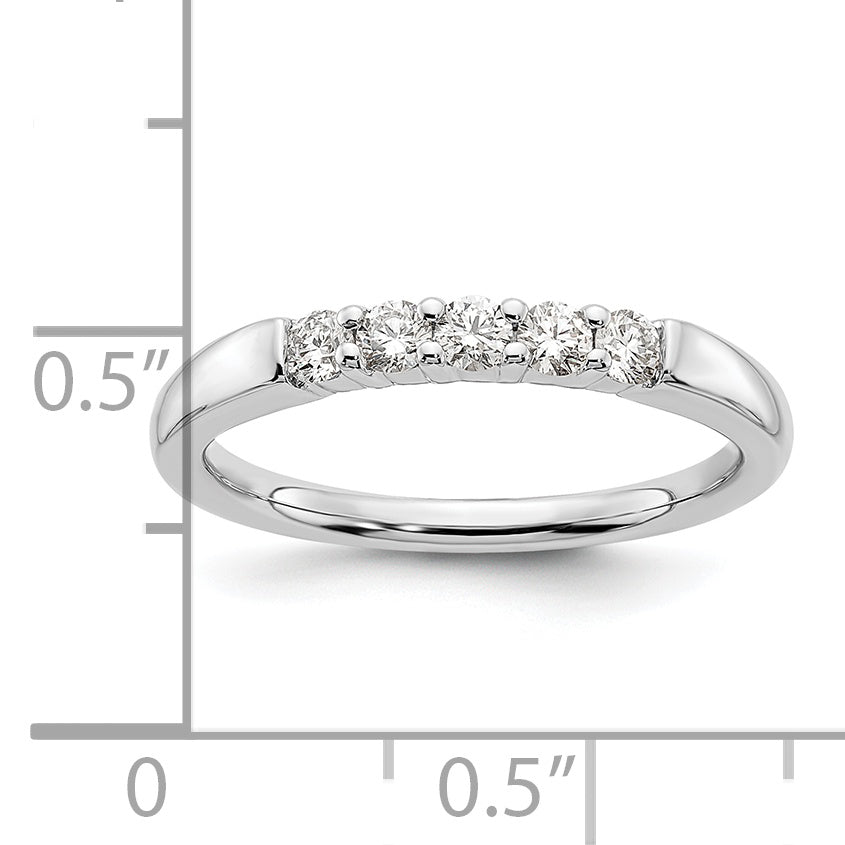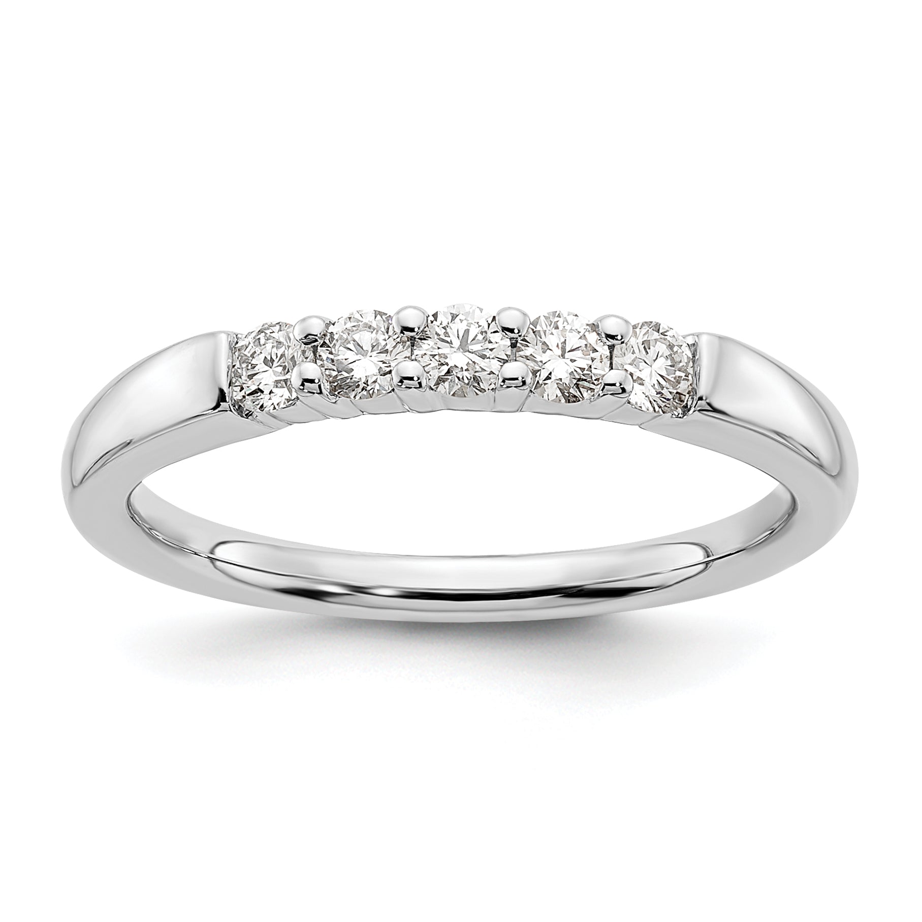 This ring has a polished finish, features two stone types, and includes five stones in total. It has a tapered band width ranging from 2.4mm to 1.9mm, and is rhodium-plated. The weight and clarity of each stone is carefully considered, and this ring is sizeable from 6 to 8 with a 0.25 increment. It is not recommended for engraving and is sold as a single item. Its classic style makes it perfect for a wedding band, but it can also be worn as a general ring for any occasion. Overall, this ring is a great investment for its quality, design, and durability.
